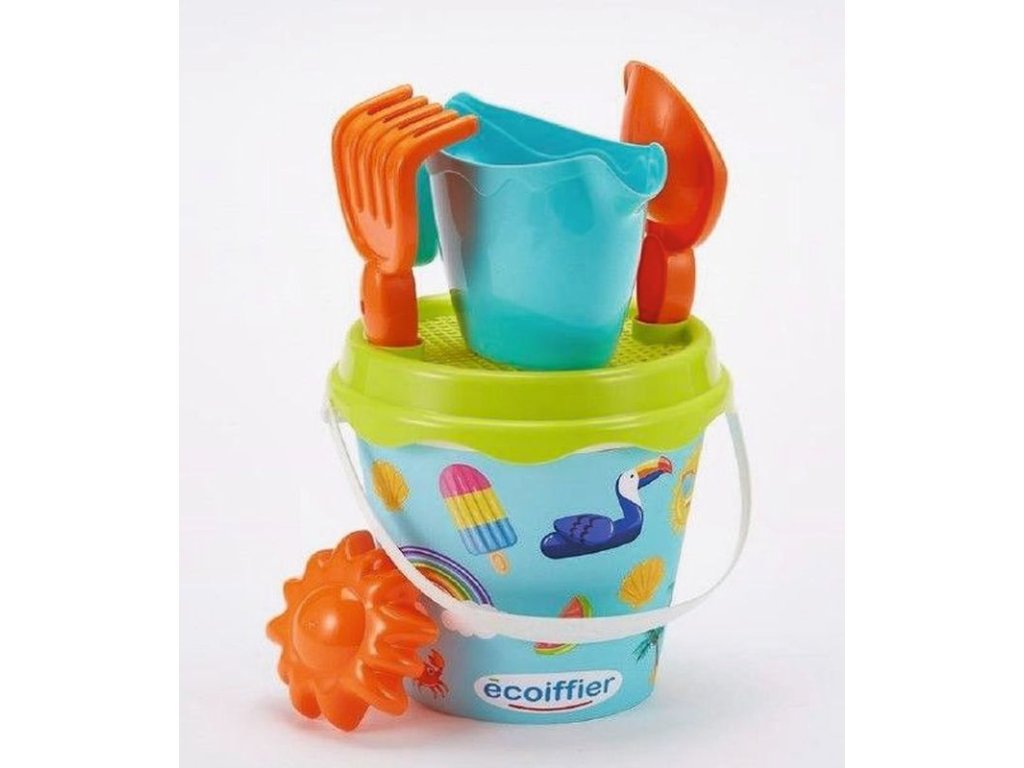Set na písek s motivem prázdnin. Obsahuje kyblíček, sítko, hrabičky, lopatičku, konvičku a formičku. Průměr kyblíčku 17 cm, výška kyblíčku 18 cm.Doplňkové parametry