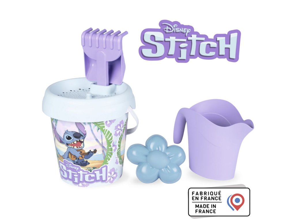 Set na písek s motivem Stitch. Součástí je sítko, hrabičky, lopatka, formička na písek ve tvaru srdíčka nebo kytičky a konvička. Průměr kyblíčku 18 cm. Výška kyblíčku s příslušenstvím 29 cm.Doplňkové parametry