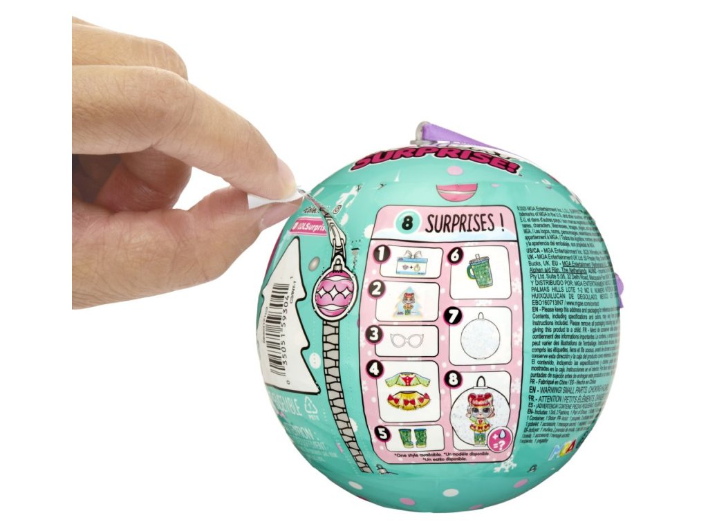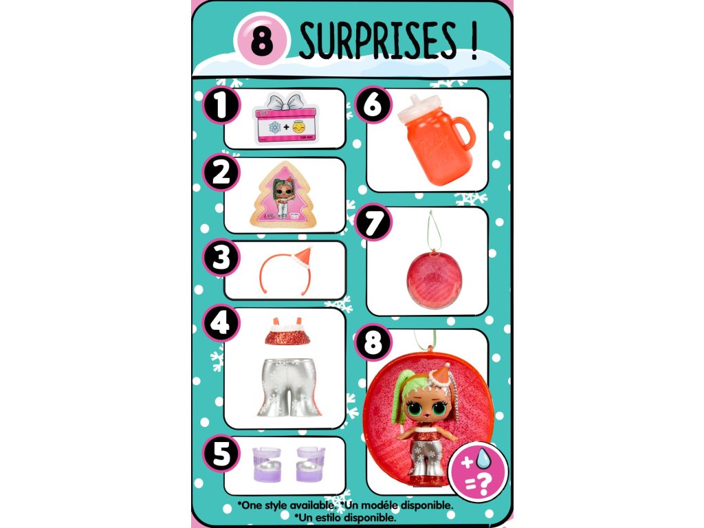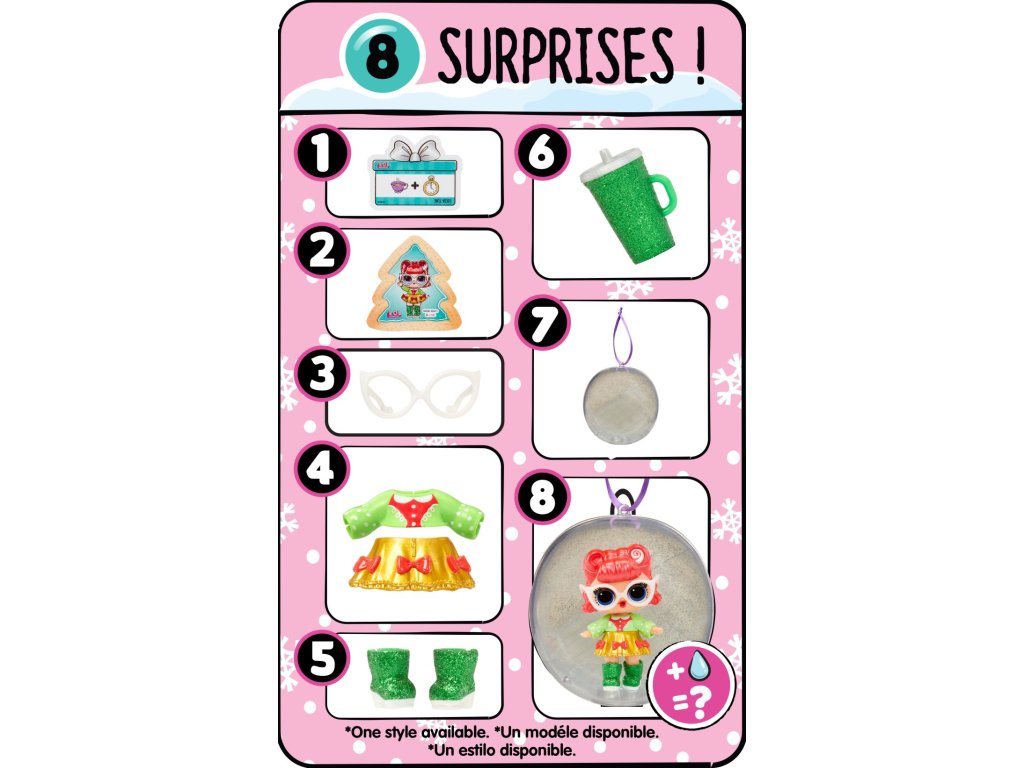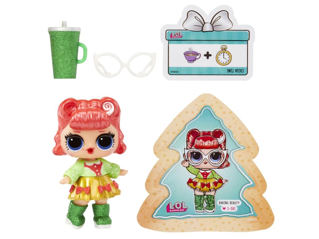 Oslavte vánoční svátky s novou limitovanou sérií. V balení najdeš panenku, která tě překvapí, když jí dáš napít z lahvičky. Doplňky a outfit jsou laděné tak, aby s tebou panenka mohla oslavit Vánoce. Obsah balení:? • 1 panenka • 2 módní doplňky • 1 pár bot • 1 doplňky • 1 lahvička • 1 tajná zpráva Velikost L.O.L. panenky: cca 8 cm.Doplňkové parametry