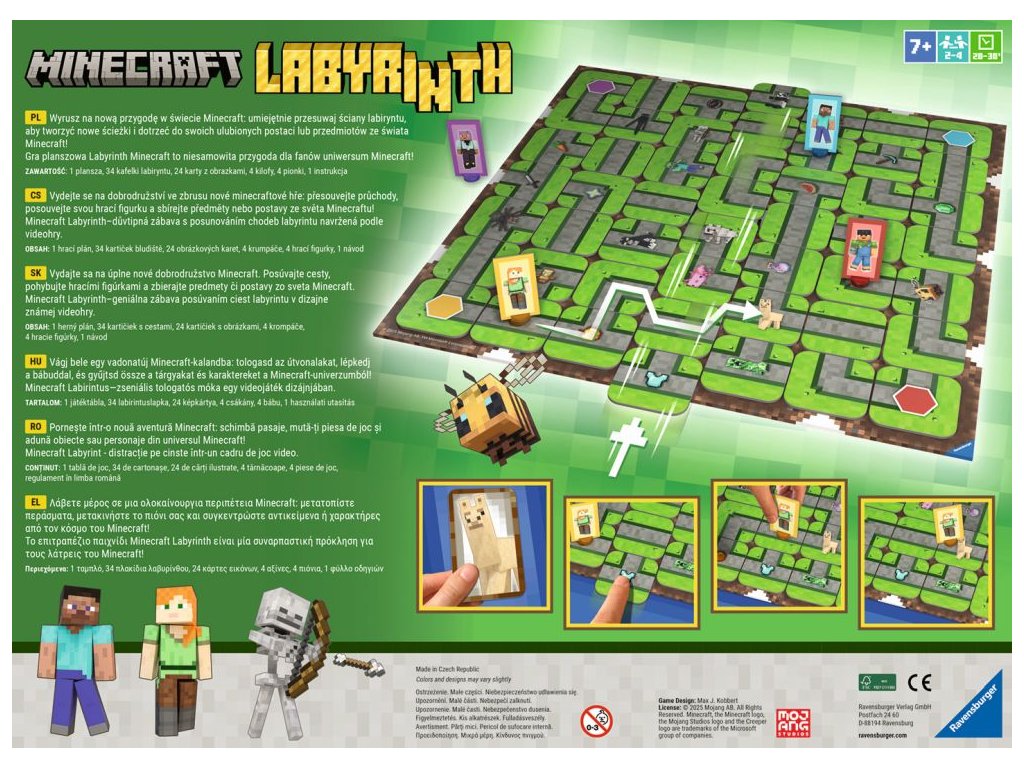 Vydejte se na jedinečné dobrodružství do bláznivého Minecraftového bludiště! S krumpáčem v ruce vstupte do spletitých chodeb, kde na vás čekají vzácné předměty i tajemná stvoření. Tato hra vás provede důmyslným labyrintem, který se neustále mění – každý posun odhaluje nové cesty, ale také skryje ty, co už znáte. Přemýšlejte strategicky, měňte podobu bludiště ve svůj prospěch a objevte záludné trasy k vítězství. Triumf získá ten, kdo dokáže nejlépe přelstít bludiště a vrátit se s cennými objevy na své startovní políčko. Obsahuje: 1 hrací plán, 34 kartiček bludiště, 24 obrázkových karet, 4 hrací figurky, 4 krumpáčeDoplňkové parametry