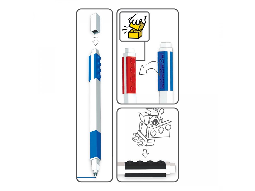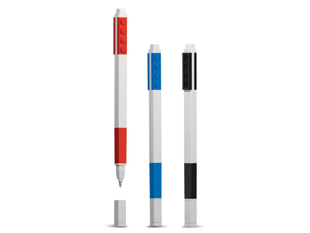 Trojice LEGO gelových per různých barev (červená, modrá, černá). Součástí pera jsou 2 proužky LEGO destičky pro spojení např. s LEGO pouzdrem, minifigurkou, jiným perem nebo k nacvaknutí na LEGO pravítko. Výrobce: IQ Hong Kong Limited FLAT A, 15/F., WAYLEE IND. CTR, 30-38 TSUEN KING CIRCUIT, TSUEN WAN, N.T., HONG KONG info@iqhk.com EU - distributor SmartLife s.r.o., Purkyňova 3091/97c, Brno 612 00 info@smartlife.cz, www.smartlife.czDoplňkové parametry