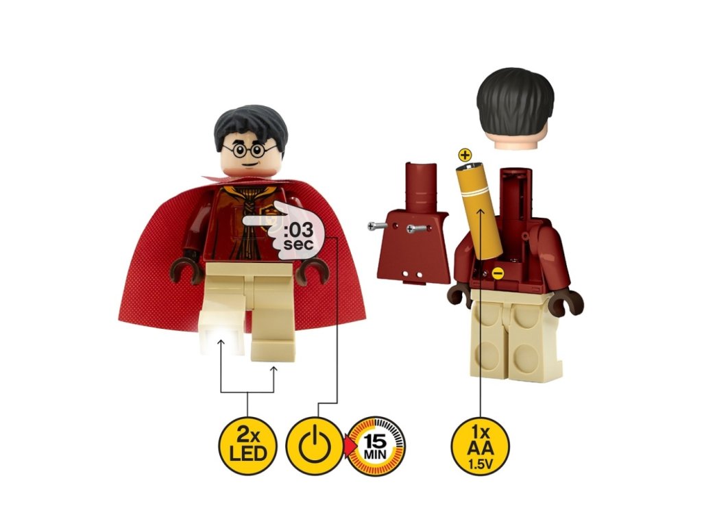 Objevujte nová kouzla s touto LEGO Harry Potter baterkou. Tlačítkem na hrudi lze rozsvítit světelné diody v nohách postavičky. Postavička má pohyblivé ruce i nohy, v oblasti zad je prostor pro vložení baterii. Baterka má též funkci světla s časovačem (15 minut). Výška postavičky cca 13 cm. Baterie součástí balení: 1xAA 1,5V. Doporučeny věk: 6+Doplňkové parametry