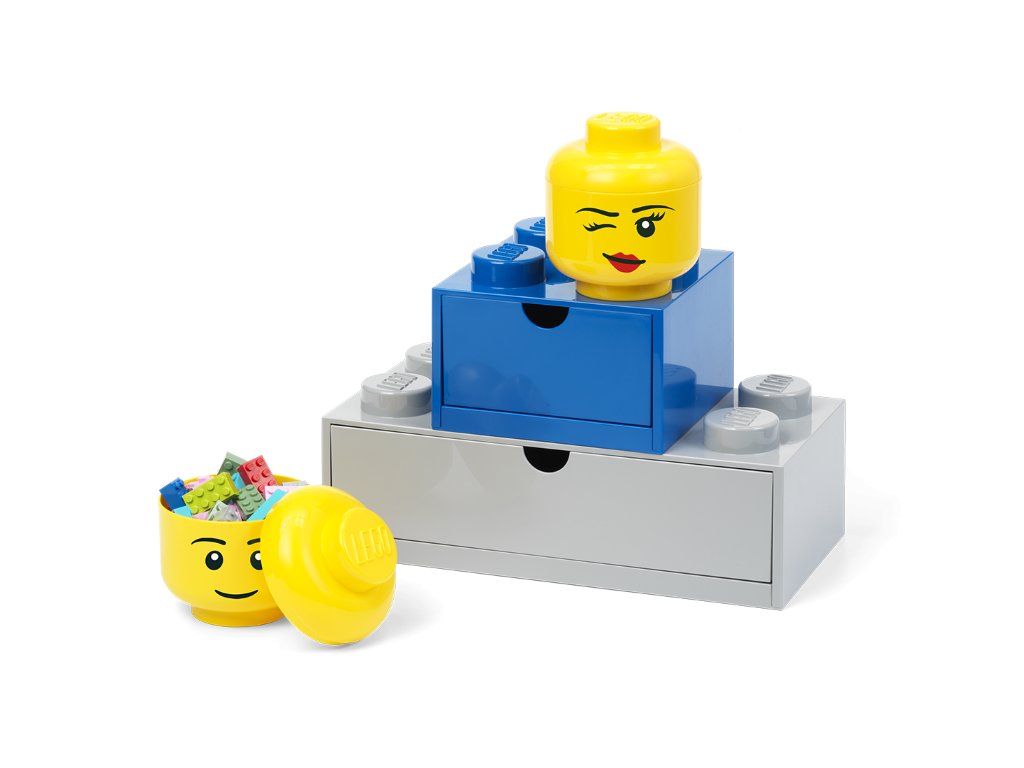 LEGO mini hlavy jsou stohovatelné a perfektně sednou i na LEGO stolní boxy se zásuvkou.