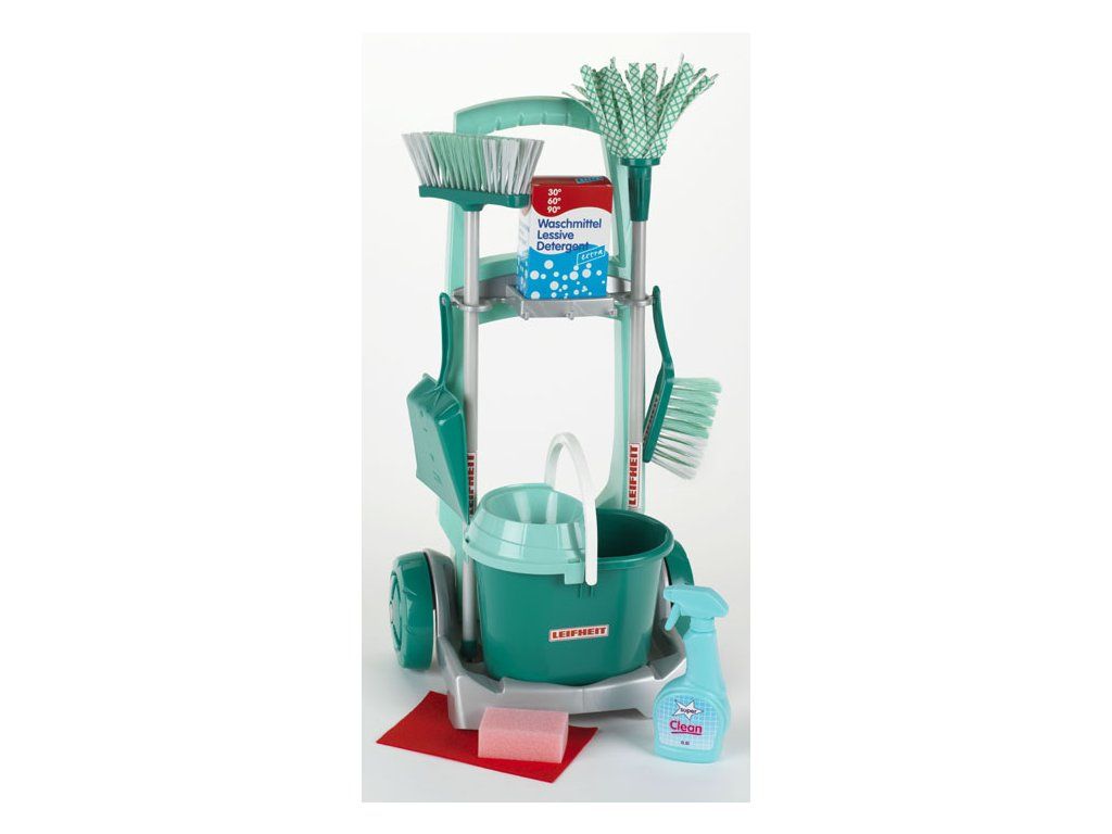 Praktický uklízecí vozík Leifheit s řadou příslušenství. Součástí balení je kbelík, mop, smeták, košťátko s lopatkou, prášek na praní, houbička, hadřík a nádoba s "čisticím" prostředkem. Materiál plast. Vhodné pro holčičky od 3 let.Doplňkové parametry