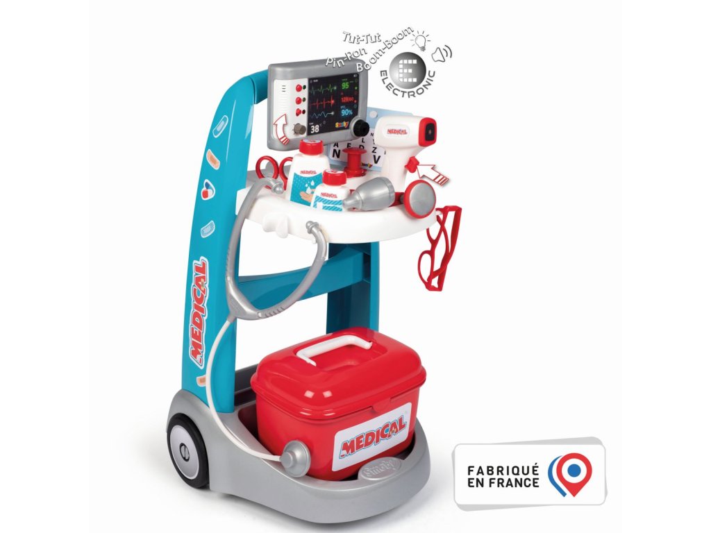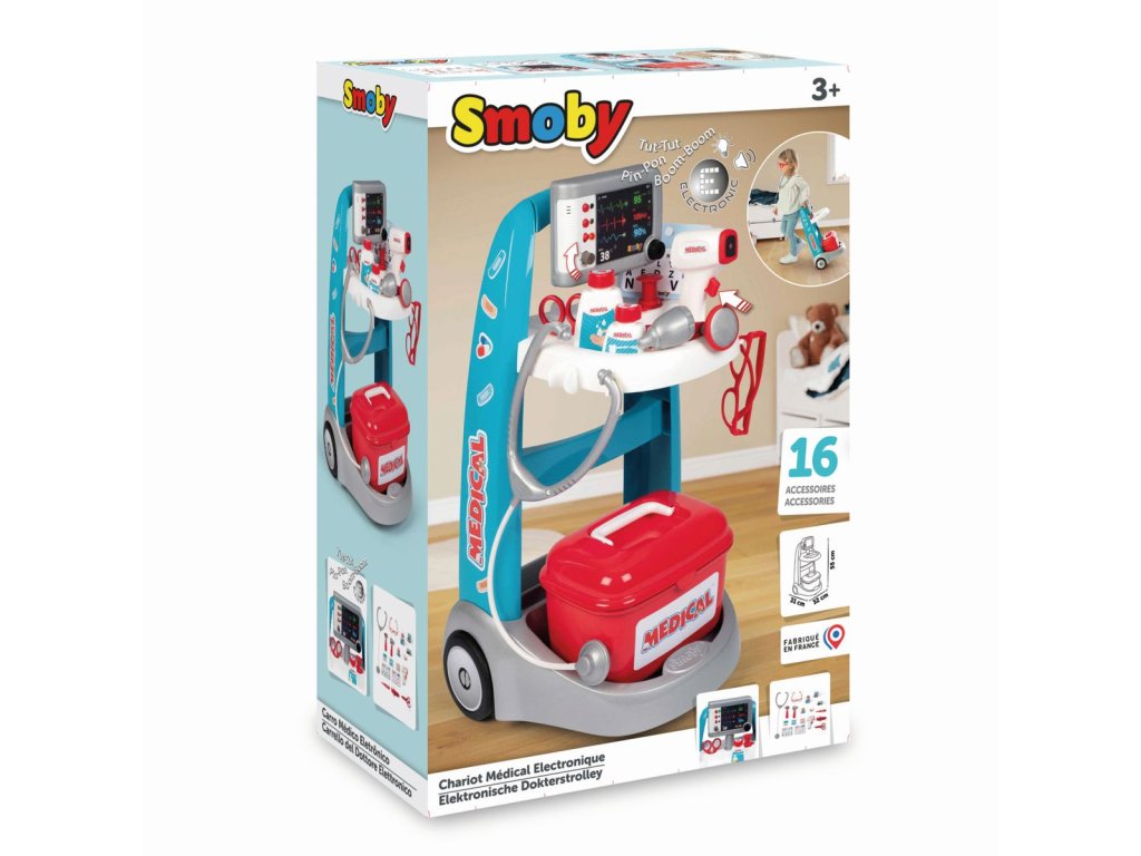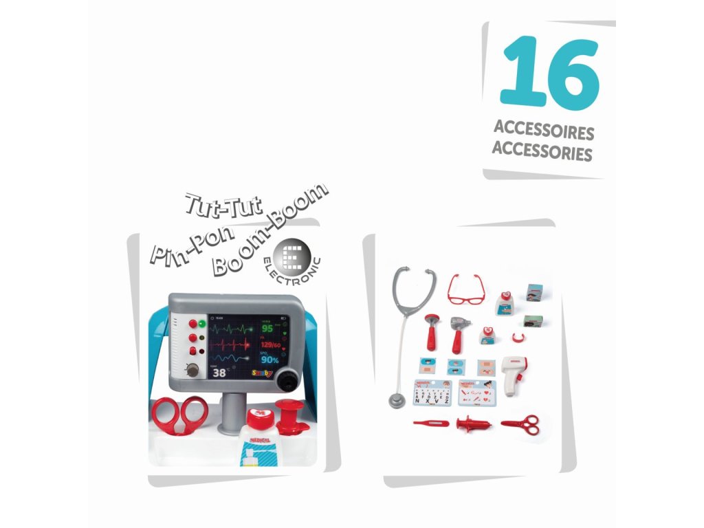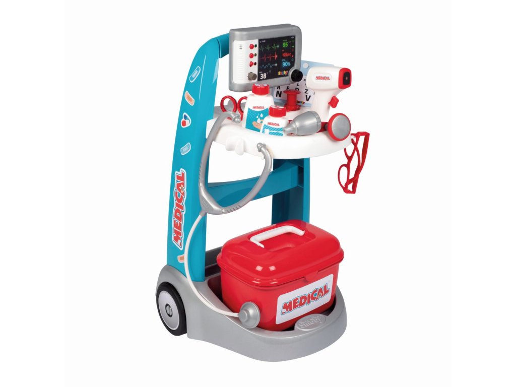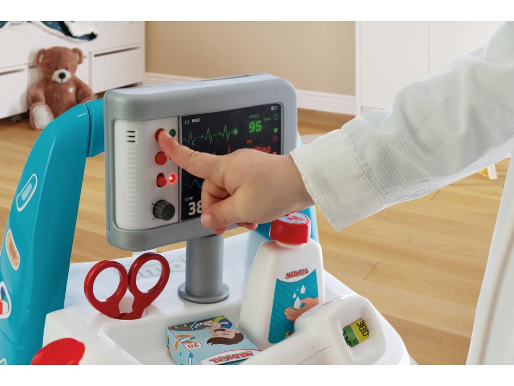Elektronický lékařský vozík se 2 kolečky. Mobilní nouzový vozík je lehký a ovladatelný i pro menší děti. Elektronický modul EKG má četné funkce a zvukové efekty, díky nimž je hra na doktora realističtější. V úložných prostorách je vše, co je třeba pro naléhavé případy pro ošetření pacientů: infuzní kapačku, lékařský kufřík s nespočtem pomůcek, jako je injekční stříkačka, teploměr, nůžky, sklenice, stetoskop, makety obalů od léků a mnoho dalšího. Rozměry produktu (DxŠxV): 31 x 32,1 x 55,2 cm.Doplňkové parametry