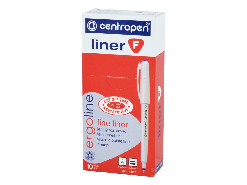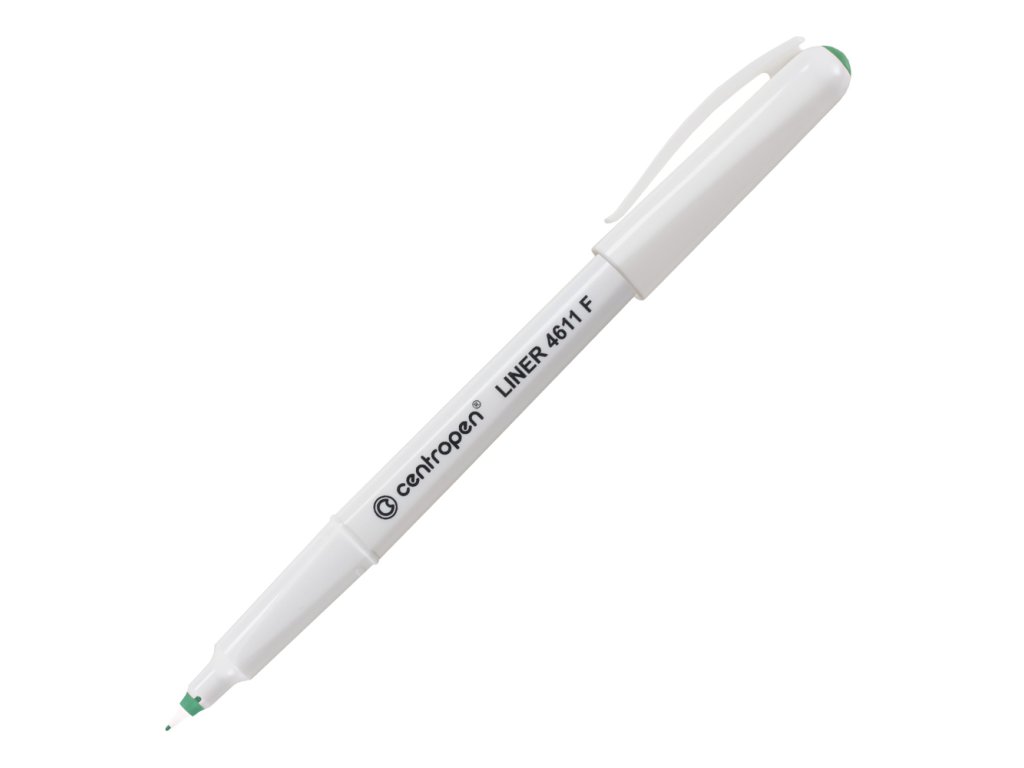 Liner CENTROPEN 4611 je osazen jemným plastickým hrotem. Má široké využití, určený je na psaní, podepisování, jemné kreslení a skicování. Šíře stopy 0,3 mm, délka stopy 1500 m. Barva: zelená.Doplňkové parametry