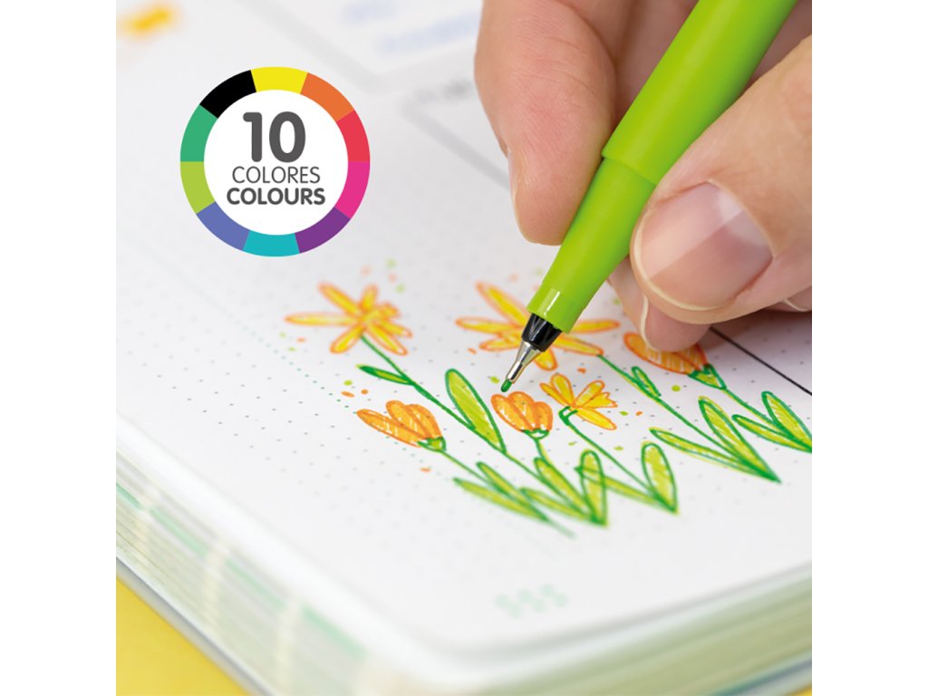 Flexibilní pouzdro obsahující 10 linerů s jemným hrotem SWAY 0,4 mm. Vláknitá špička s kovovou podpěrou. Design SWAY s ergonomickým kulatým tvarem. Barvy: žlutá, oranžová, červená, růžová, fialová, modrá, světle modrá, zelená, světle zelená a černá.Doplňkové parametry