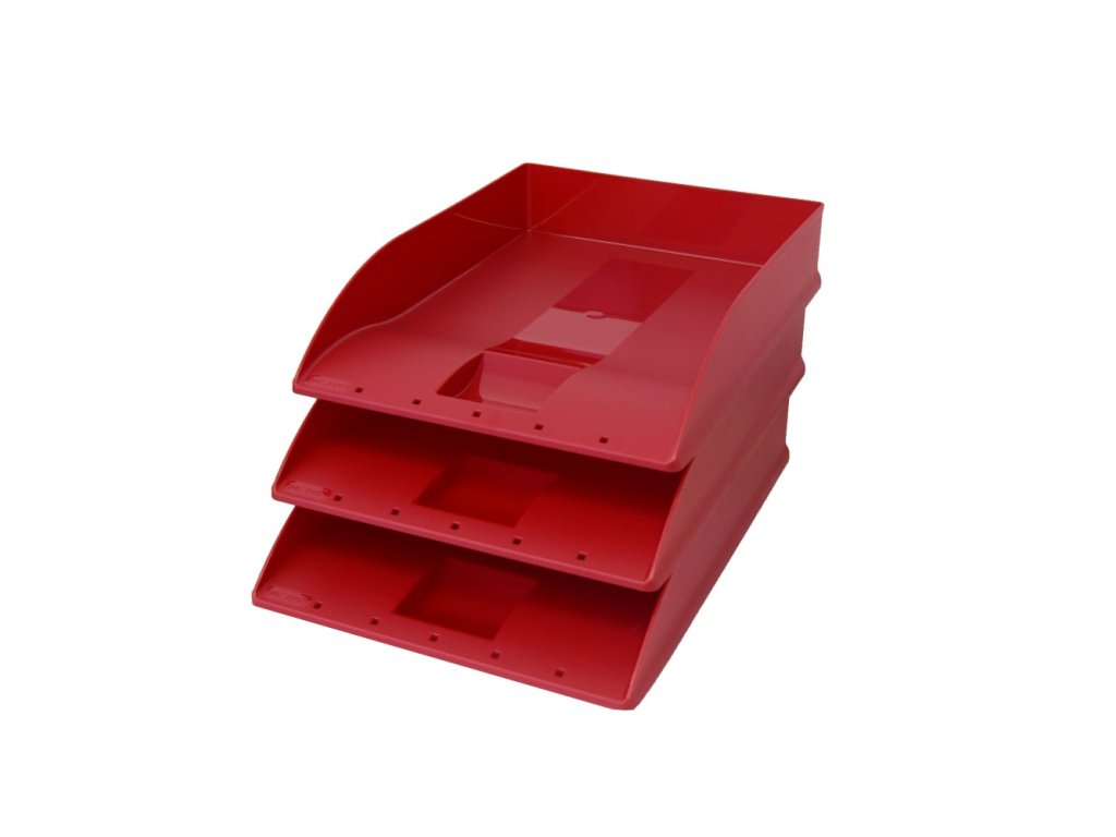 Stohovatelný plastový odkladač dokumentů formátu A4.