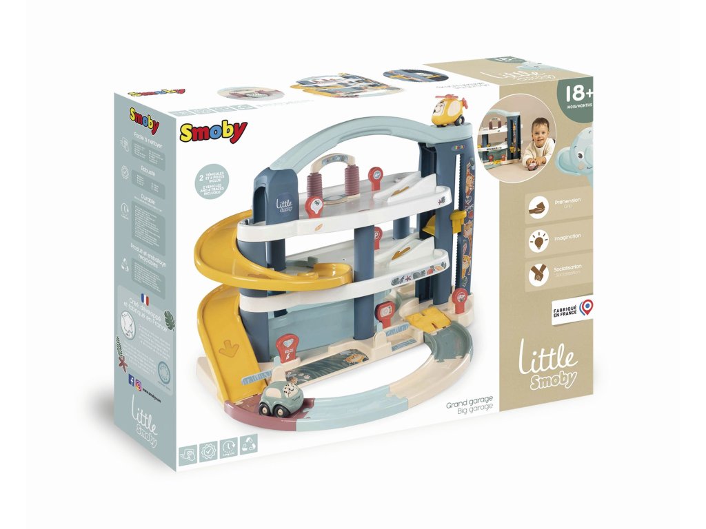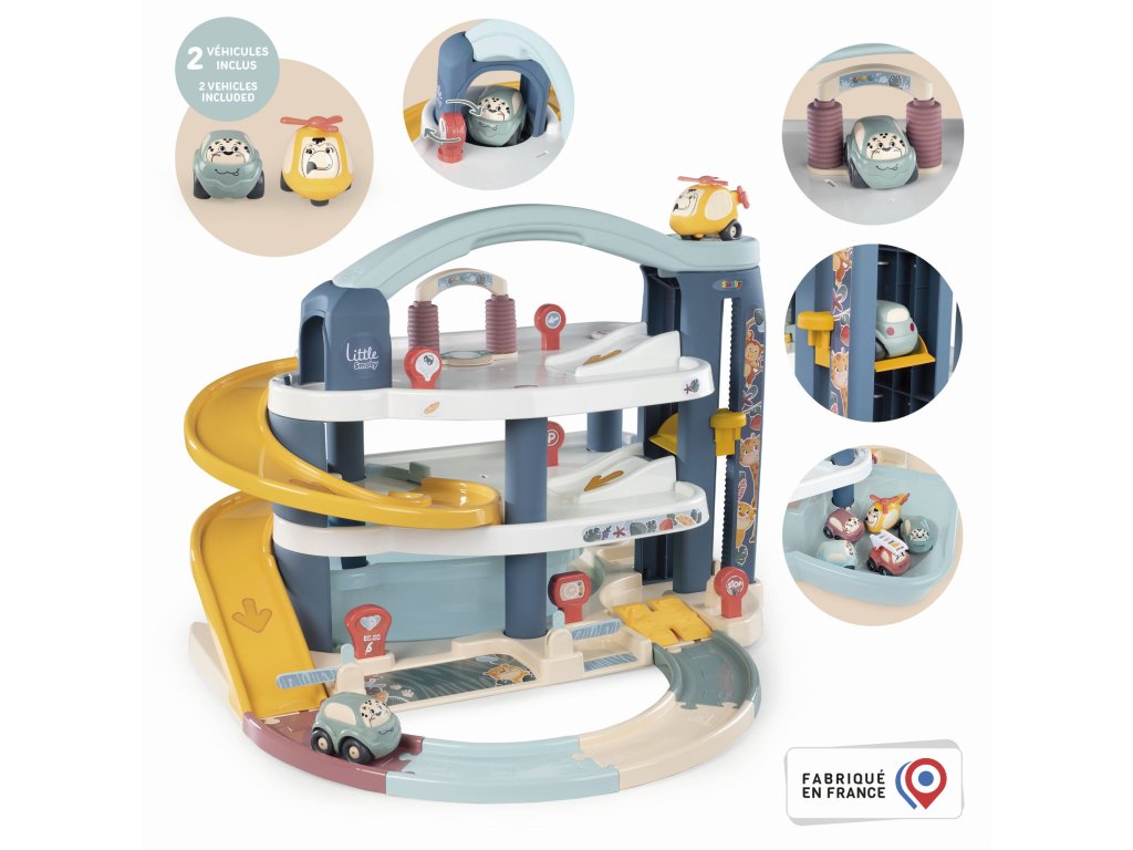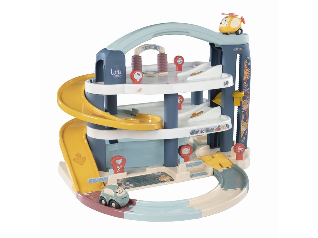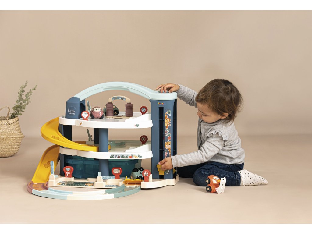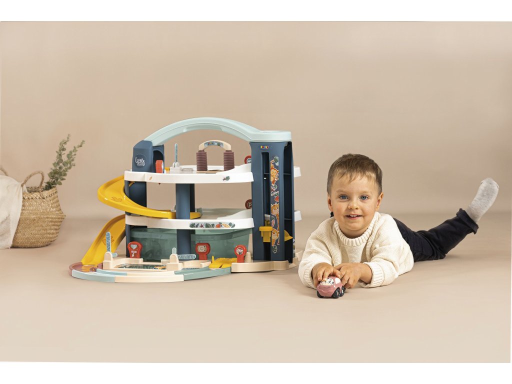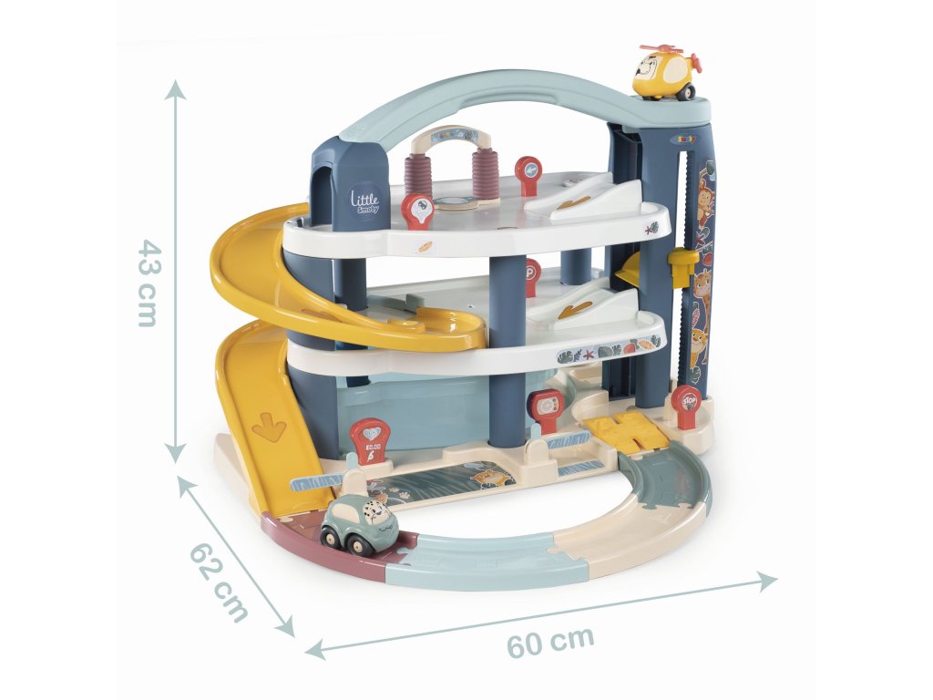 Velká patrová parkovací garáž Little Smoby. Na 3 podlažích je co objevovat. Mini autíčka pohodlně cestují výtahem, sjíždí přes široké tratě nebo tajnou cestou, kterou lze snadno otevřít pákou. Součástí je myčka, servisní dílna se zvedací plošinou, benzínová pumpa a úložný box. Sada obsahuje mini autíčko a mini vrtulník. Velké vícepodlažní parkoviště je vyrobeno v osvědčené Smoby kvalitě ze zdravotně nezávadných materiálů. Rozměry (DxŠxV): 62 x 60 x 43 cm.Doplňkové parametry