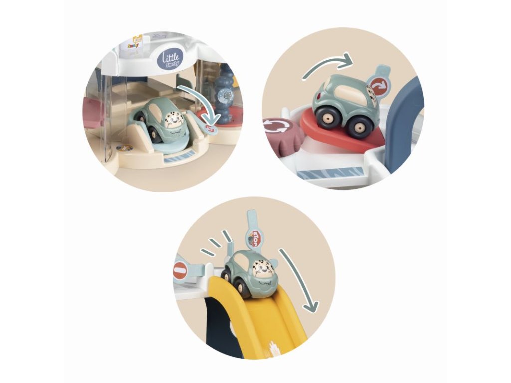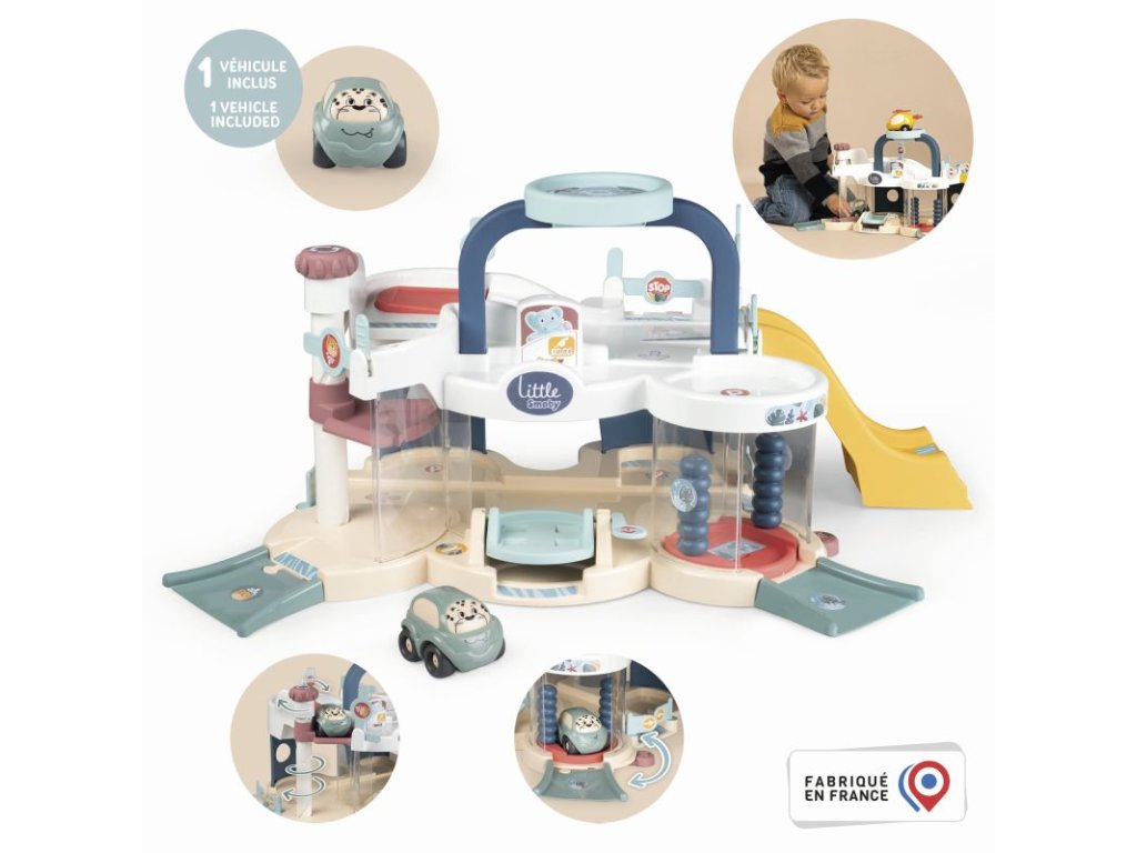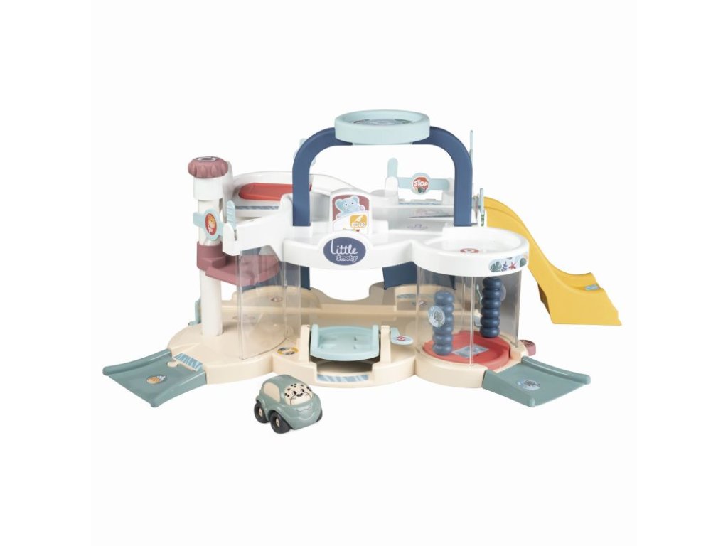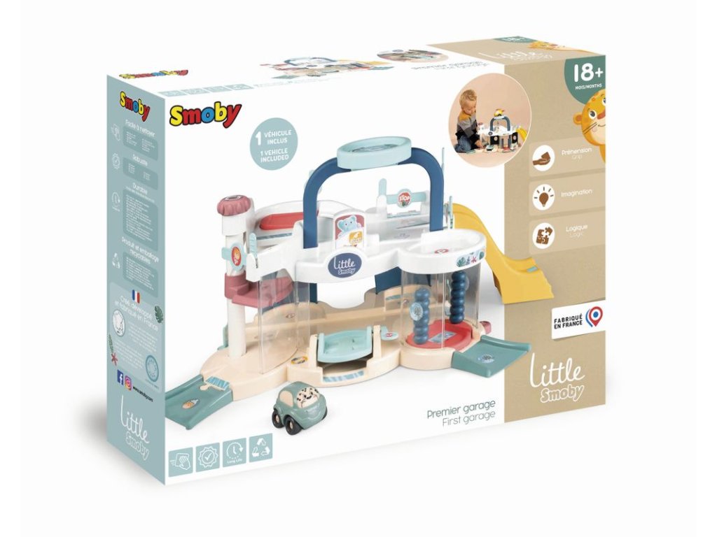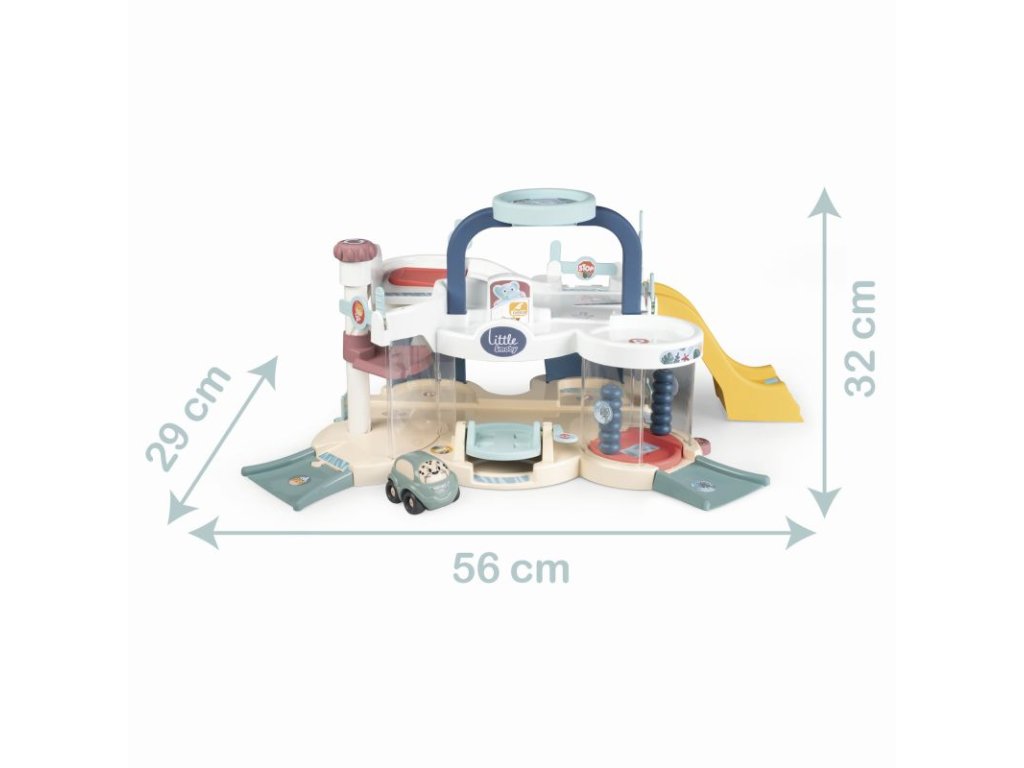 Multigaráž Little Smoby má velký otočný nákladní výtah, parkoviště a velké rampy ke sjíždění. Skoková rampa poskytuje potřebnou hybnost pro rychlejší jízdu. Pohyblivé zábrany ukazují, kde je průjezd zakázán, protože rampa může být instalována na dvou různých místech. Nad parkovací plochou je helipad, kde startuje a přistává vrtulník. Ve spodní části multigaráže s dílnou a myčkou je o autíčka dobře postaráno. Široké nájezdové rampy a zábrany zajišťují regulovaný proces. Sada obsahuje jedno mini autíčko. Rozměry produktu (DxŠxV): 56 x 29 x 32 cm.Doplňkové parametry