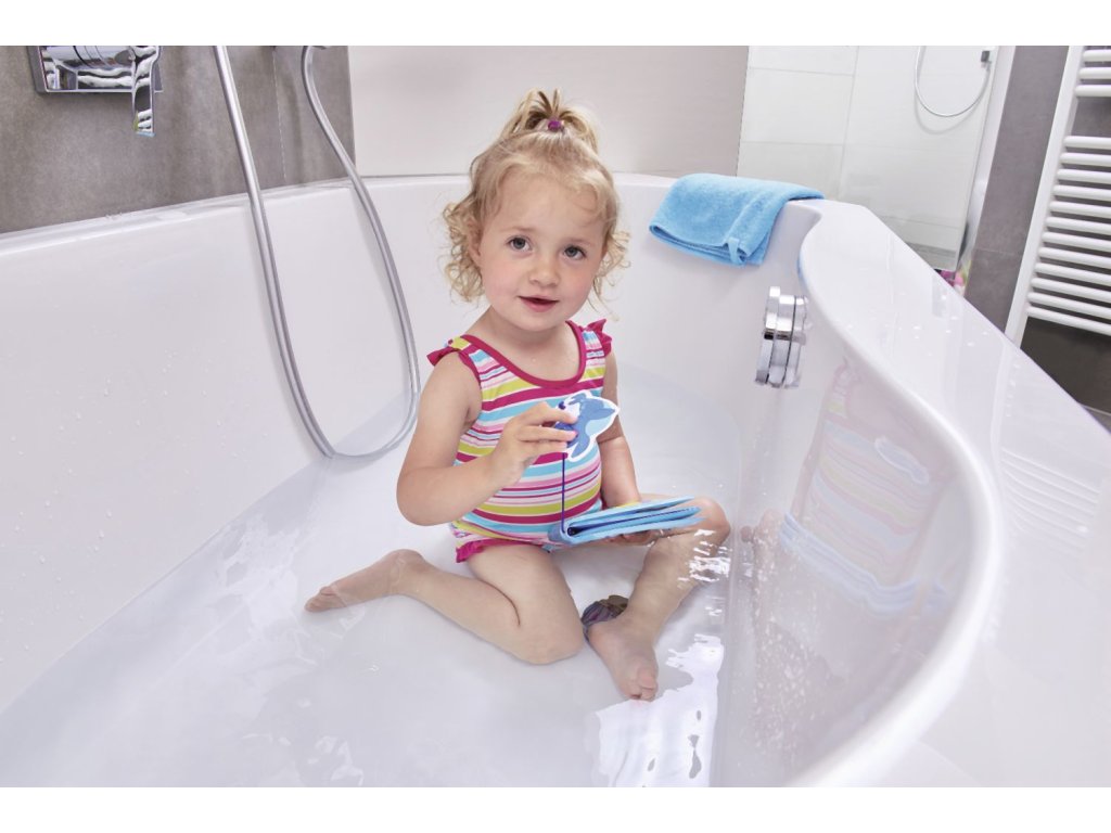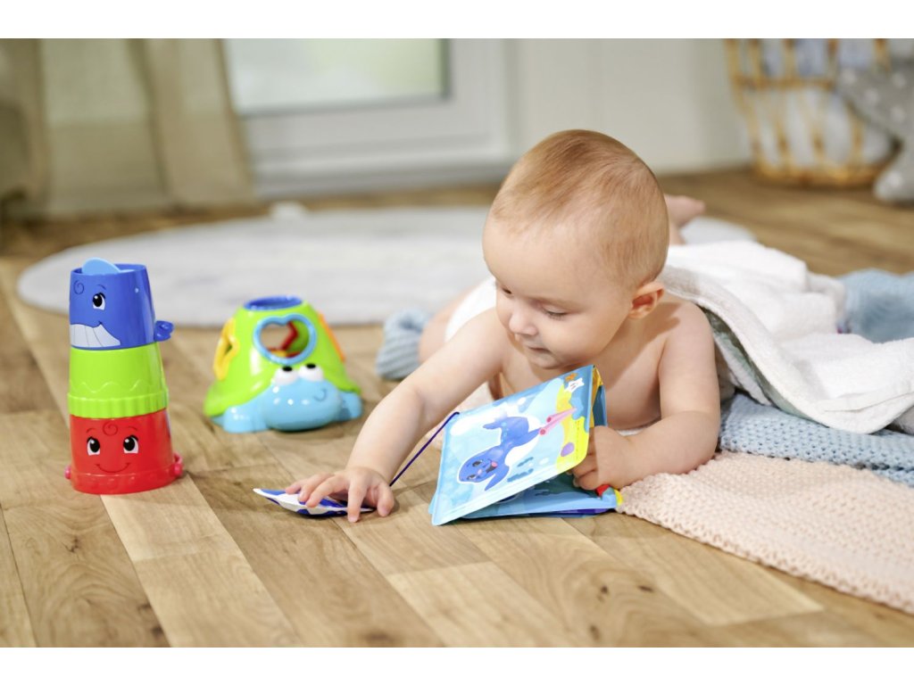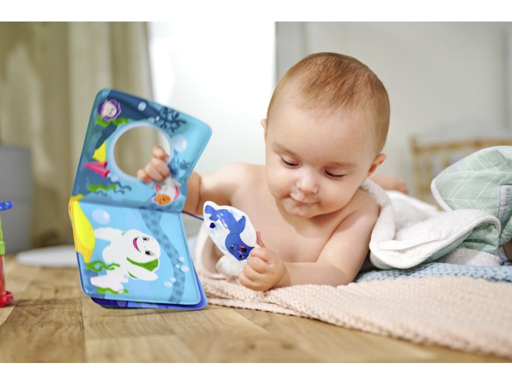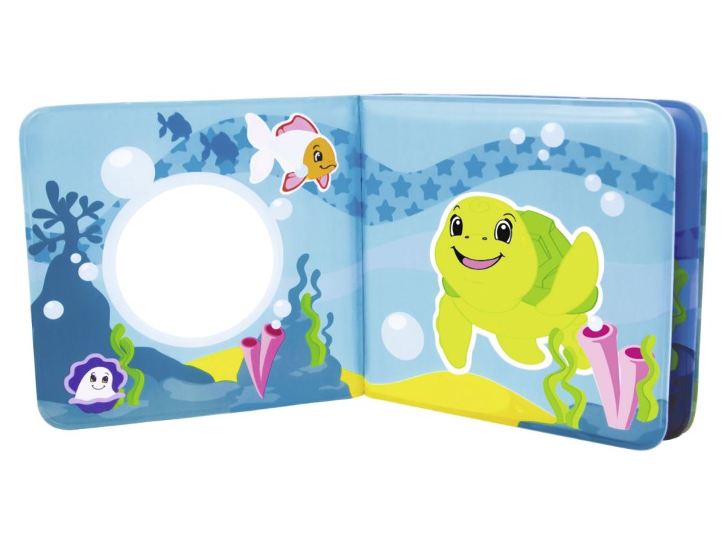 Knížka do vody pro nejmenší s pískacím přívěskem. Má 8 stran s obrázky mořských zvířátek. Rozměr zavřené knížky: 13x13cm.Doplňkové parametry