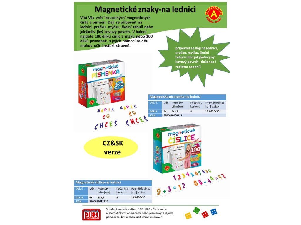 Magnetická písmenka se dají připevnit na lednici, pračku, myčku, školní tabuli nebo jakýkoliv jiný kovový povrch - dokonce i radiátor topení! V balení najdete celkem 100 dílků s písmenky, s jejichž pomocí si děti mohou poskládat libovolný text i věty a mohou se učit i hrát si zároveň. Balení obsahuje české i slovenské znaky abecedy. Vítá Vás svět "kouzelných" magnetických písmenek. Pro děti od 4 let.Doplňkové parametry