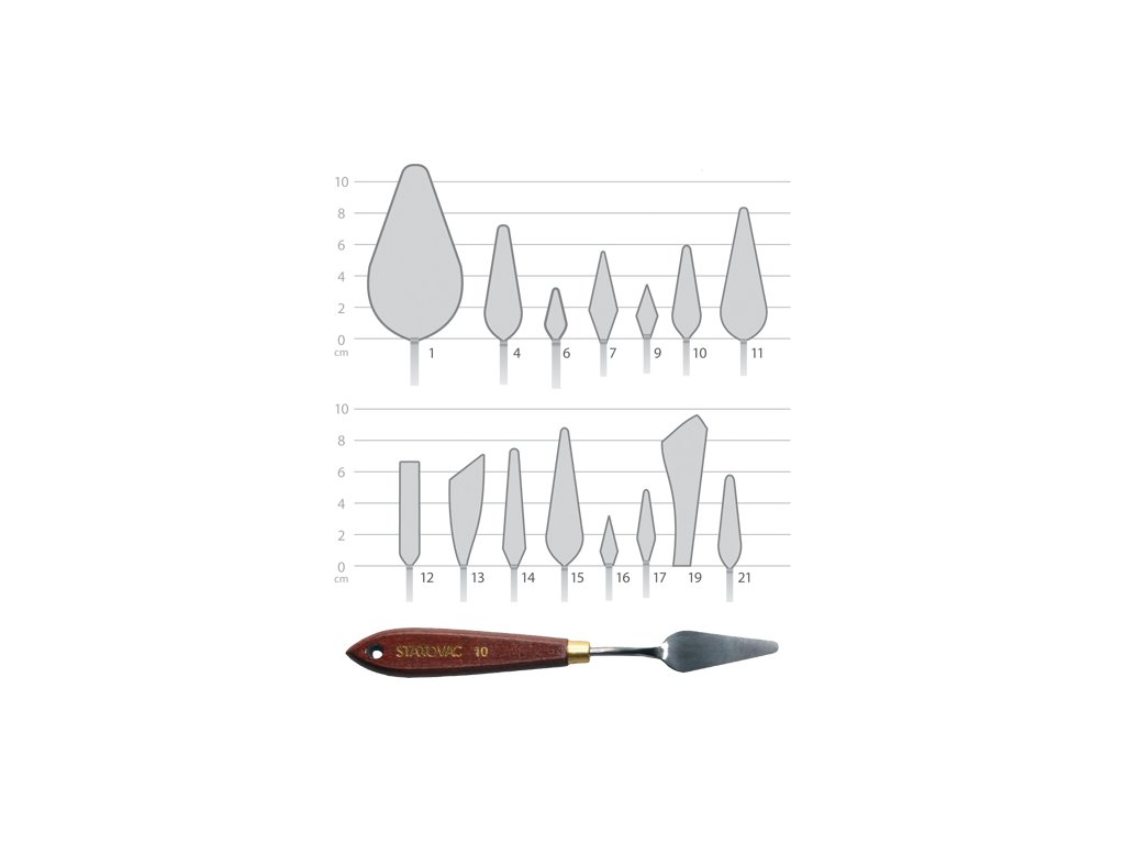 Malířské špachtle Junior vyrobené pro začínající i náročné umělců, jsou dokonalým spojením funkčnosti, kvality a elegance. Mají elektrolytický povlak, který způsobuje, že je špachtle odolná proti korozi. Leštěná čepel je osazena mosazným kováním a tvrdouDoplňkové parametry