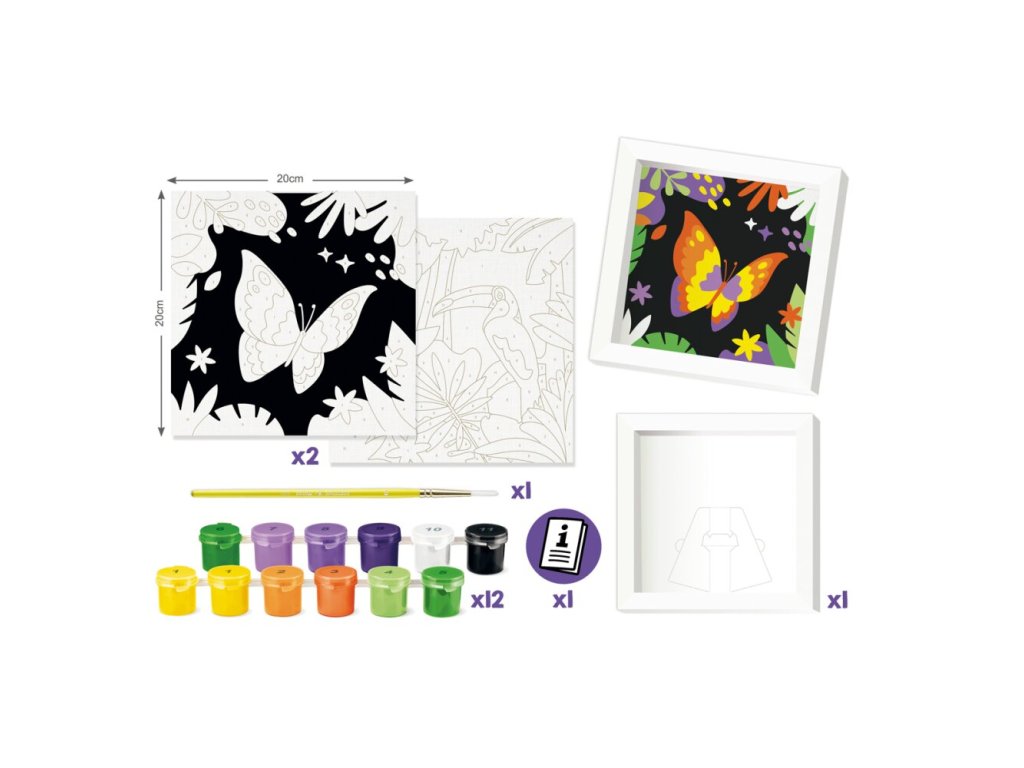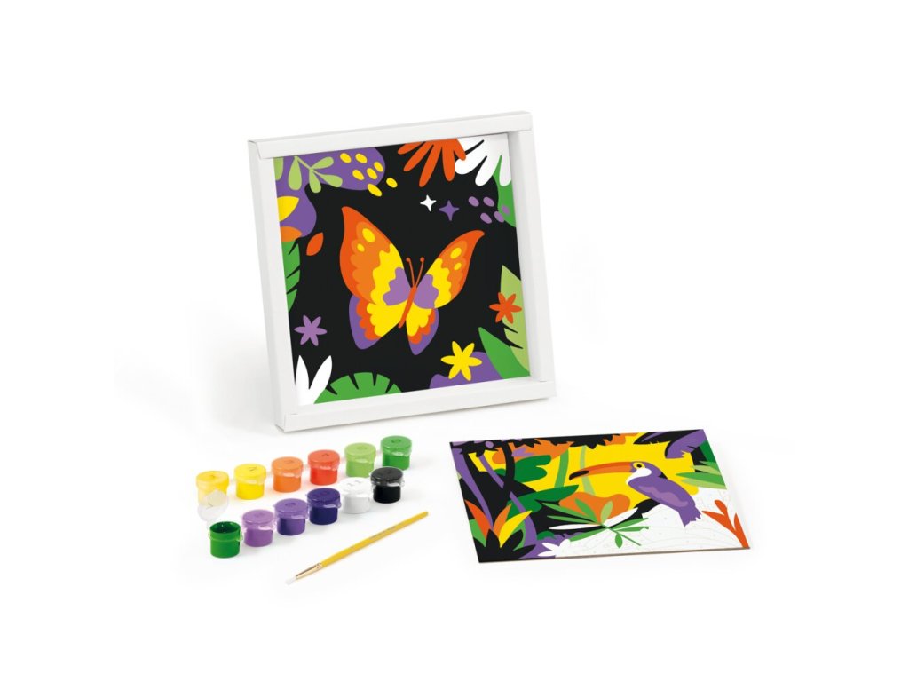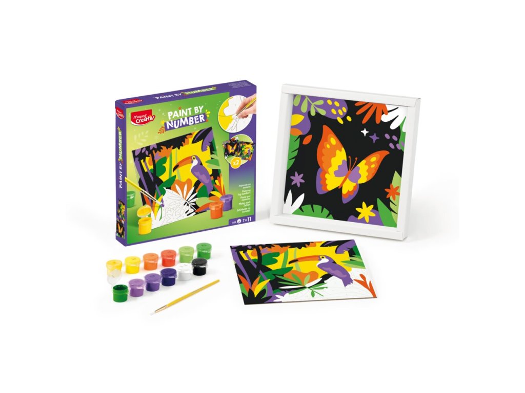 Kreatívna sada Maped Creativ Paint by number s motívmi tukana a motýľa na vytváranie krásnych obrázkov pomocou techniky maľovania podľa čísel. Sada obsahuje 2 číslované šablóny na vyfarbenie , 12 fľaštičiek s akrylovými farbami, štetec a rámček na vystavenie obrázku.Sada obsahuje: