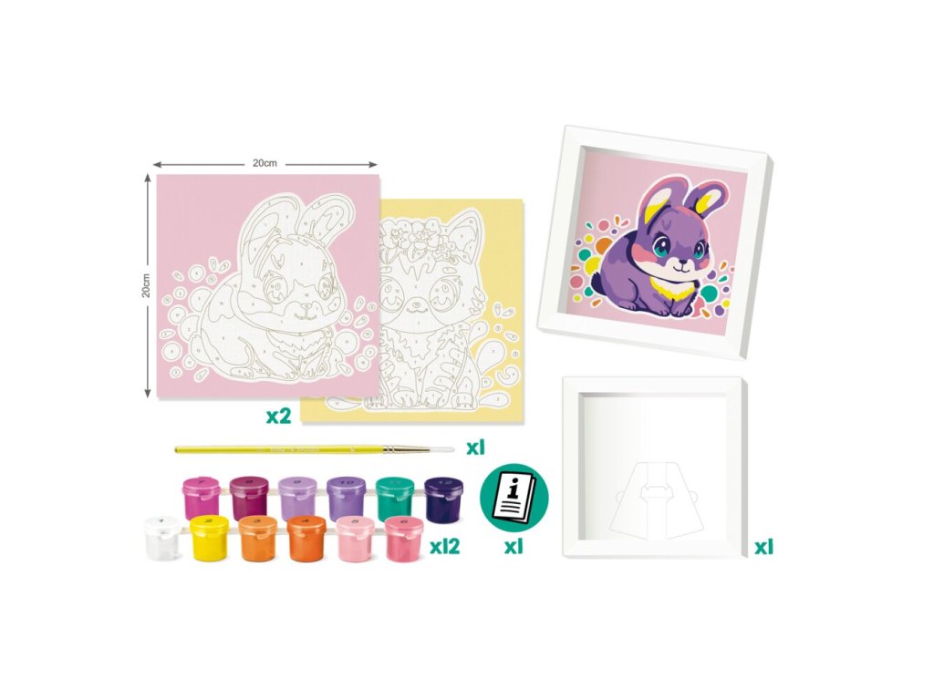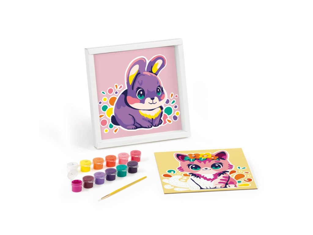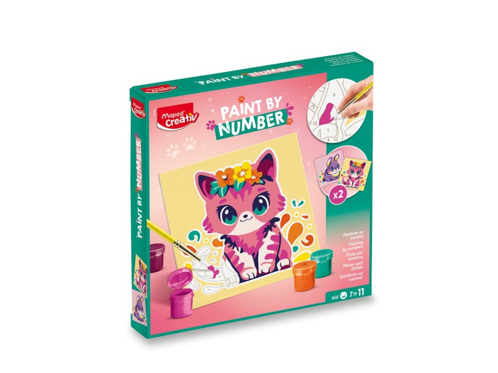 Kreatívna sada Maped Creativ Paint by number s motívmi mačky a králika na vytváranie krásnych obrázkov pomocou techniky maľovania podľa čísel. Sada obsahuje 2 číslované šablóny na vyfarbenie , 12 fľaštičiek s akrylovými farbami, štetec a rámček na vystavenie obrázku.Sada obsahuje:
