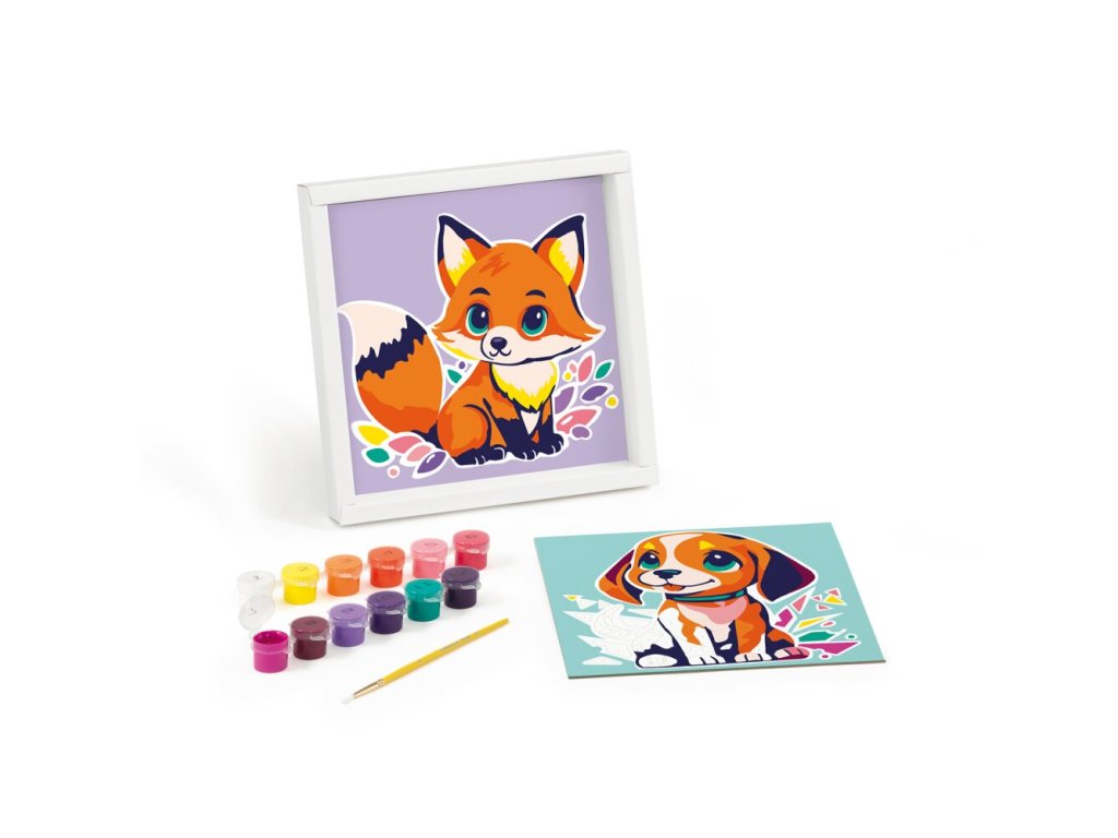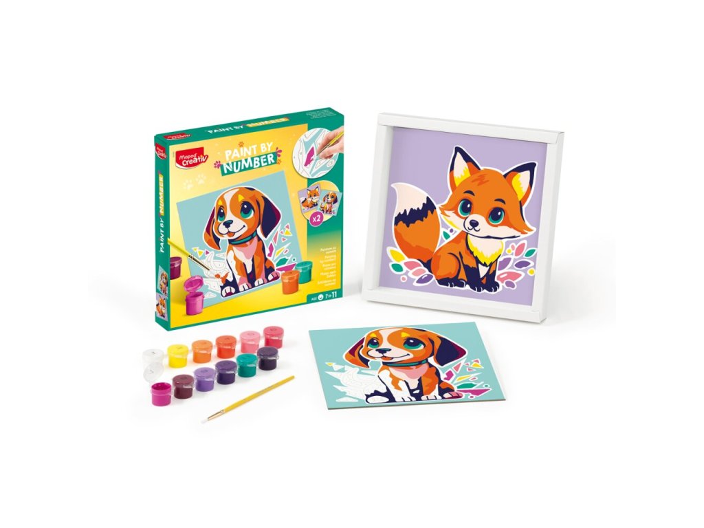 Kreatívna sada Maped Creativ Paint by number s motívmi psa a líšky na vytváranie krásnych obrázkov pomocou techniky maľovania podľa čísel. Sada obsahuje 2 číslované šablóny na vyfarbenie , 12 fľaštičiek s akrylovými farbami, štetec a rámček na vystavenie obrázku.Sada obsahuje: