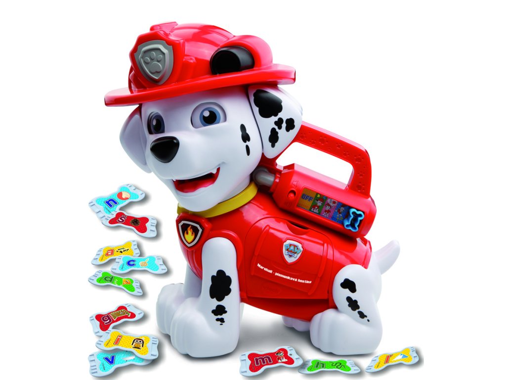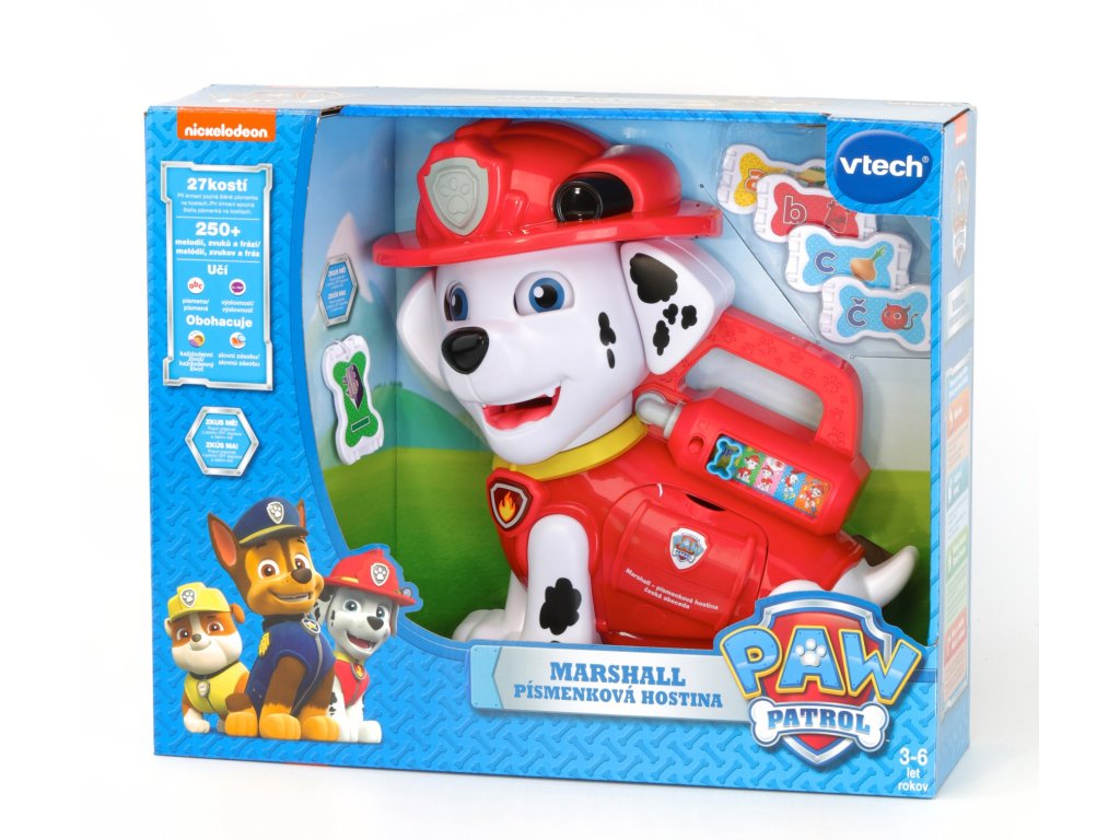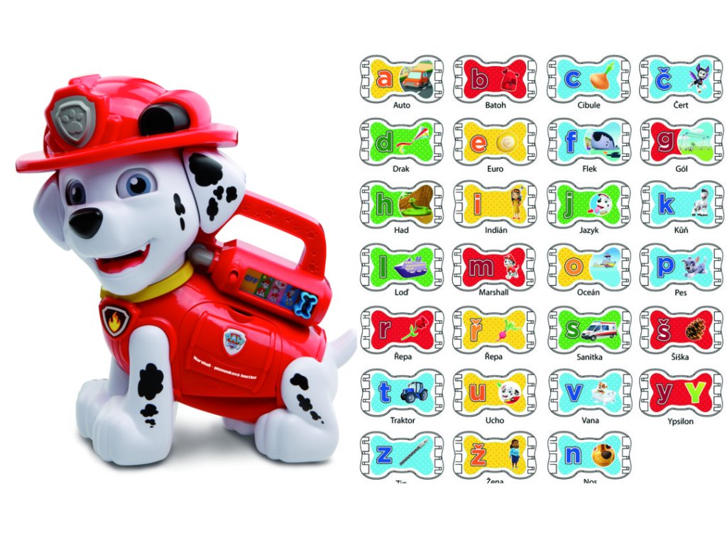 Marshall - Písmenková hostina. Naučte se společně s Marshallem poznat písmena české abecedy. Marshallovi stačí vložit do tlamičky kostičku a on hned pozná jaké písmenko je na kostičce vyobrazeno. Marshall ale také zkouší, jestli už písmena poznáte sami. Např. vás vyzve: „Pomož mi prosím najít a zachránit písmeno Č“. Když jste splnili úkol dobře, tak vás pochválí a navíc třeba přidá slovo, ve kterém se písmeno používá. Například: „Č – jako Čert“. A tak dále. To ale není zdaleka vše, co Marshall umí. Dokáže použít i vybrané písmenko nejen ve slovech, ale i v celých větách. Například pro slovo čert si vymyslí větu: „Každý přece ví, že čerti nejsou. Nebo jsou?“ Marshall také dokonale pozná barvy, které jsou na kostech vyobrazeny, stejně tak i pojmenuje obrázky z každé kostičky. Víte jaké písmeno, je v abecedě před „R“? Ne?. Potom se zeptejte Marshalla. Ten to zaručeně ví a naučí to i vás! Marshall dokonce i zahraje známé melodie a veškerou svojí činnost doprovází rozkošným mrkáním a hýbáním uší! Marshall zná více jak 500 různých frází, které Vás zabaví na hodně, hodně, hodně dlouhou dobu! Příjemnou zábavu s Marshall - Písmenková hostina Vám přeje VTECH. Pro děti od 3 let. Rozměr 30x30x10cm. 2x AA baterie jsou součástí balení.Doplňkové parametry