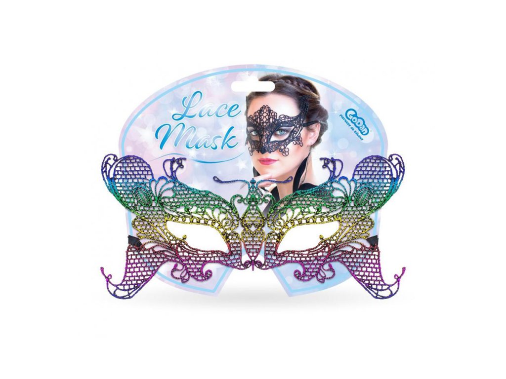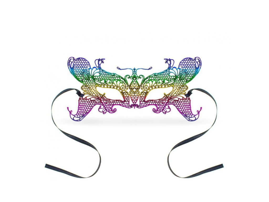 Karnevalová maska na obličej pro dospělé. Výška: 11,5 cm Šířka: 23,5 cm Barva: duhová Materiál: prolamovaná maska a saténová stuha.Doplňkové parametry