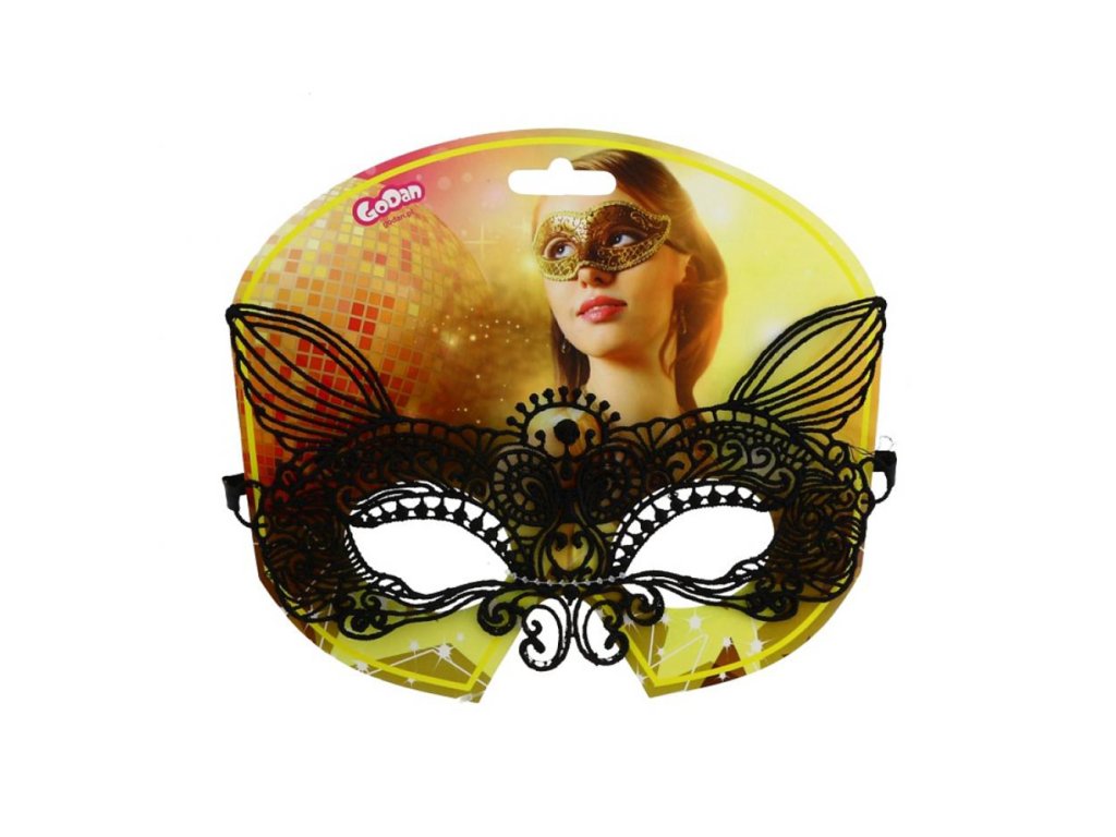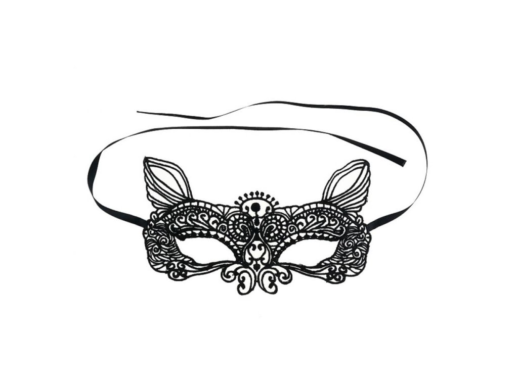 Karnevalová maska na obličej pro dospělé. Výška: 7,5 cm Výška s ušima: 11,5 cm Šířka: 19,5 cm Barva: černá Materiál: prolamovaná maska a saténová stuha. Maska je určena pro dospělé.Doplňkové parametry