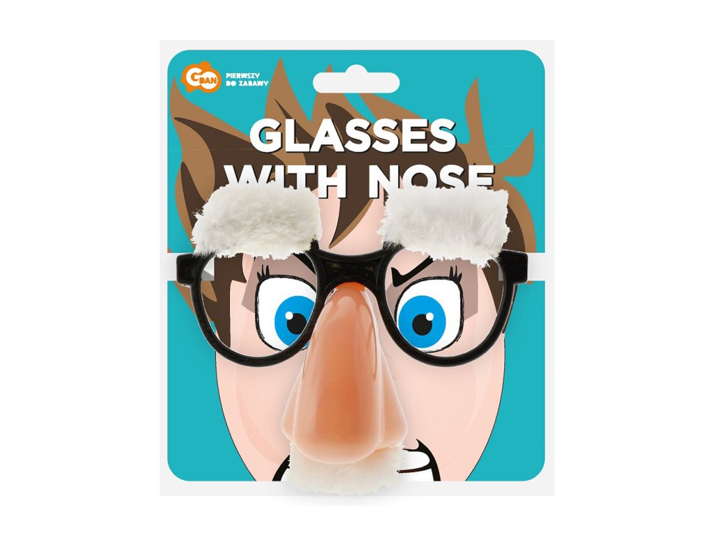 Černý rám brýlí s připevněným umělým obočím a úzkými vousy pod nosem.