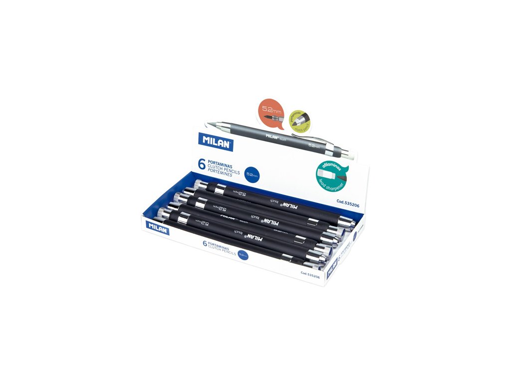 Jedinečná mechanická tužka MILAN s průměrem tuhy 5,2mm. S integrovaným struhadlem, které prostě vyberete odšroubováním zhutňovacího mechanismu. Hladké, kulaté tělo v matné černé barvě se stříbrnými doplňky.Doplňkové parametry