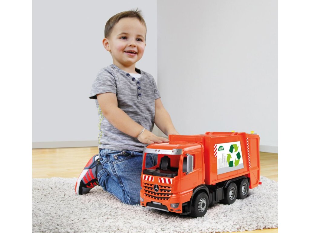 Mercedes Arocs popelář. 6mm tlusté kovové osky u kol. Součástí je pojistka proti nežádoucímu vyklopení. 1x malá + 1x velké popelnice. Vyrobeno v ČRDoplňkové parametry