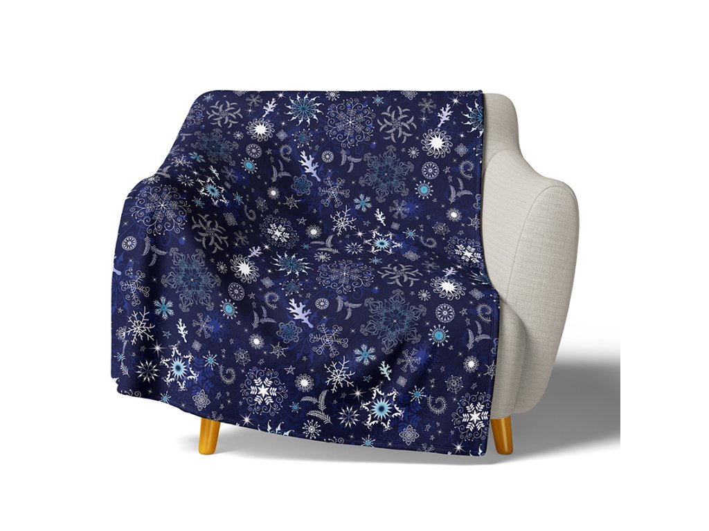 Na tmavě modré plyšové dece jsou stříbrné vločky v mnoha různých tvarech a velikostech