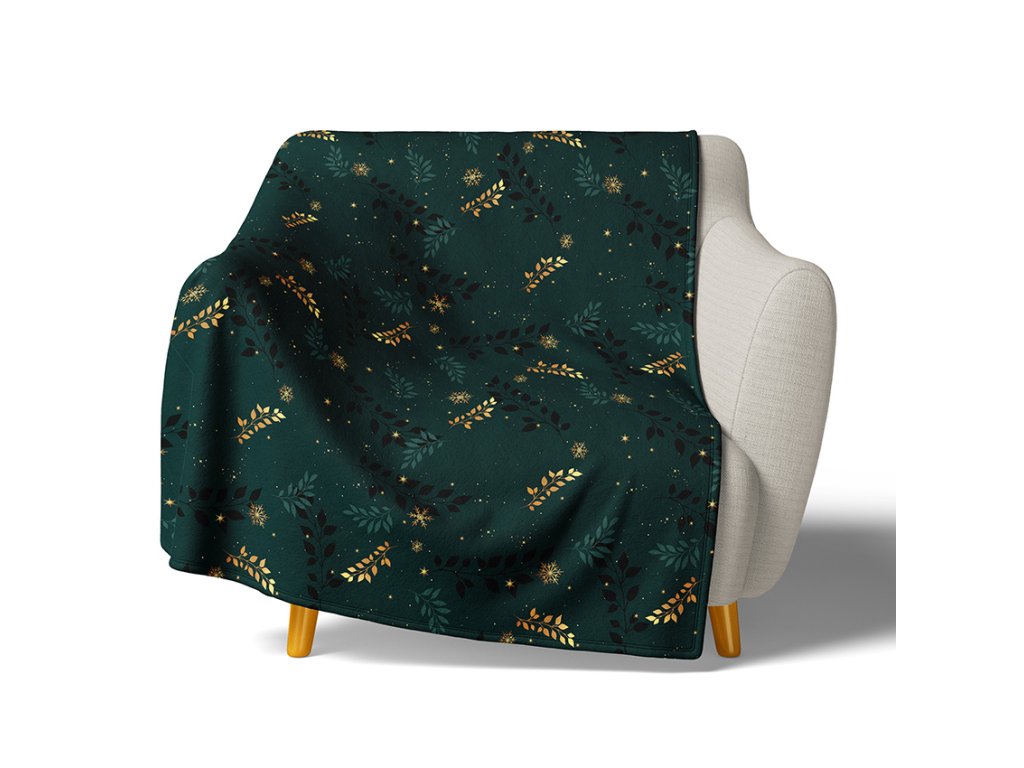 Na tmavě zeleném dece jsou elegantní větvičky ve zlatých a zelených odstínech doplněné o zlaté sněhové vločky