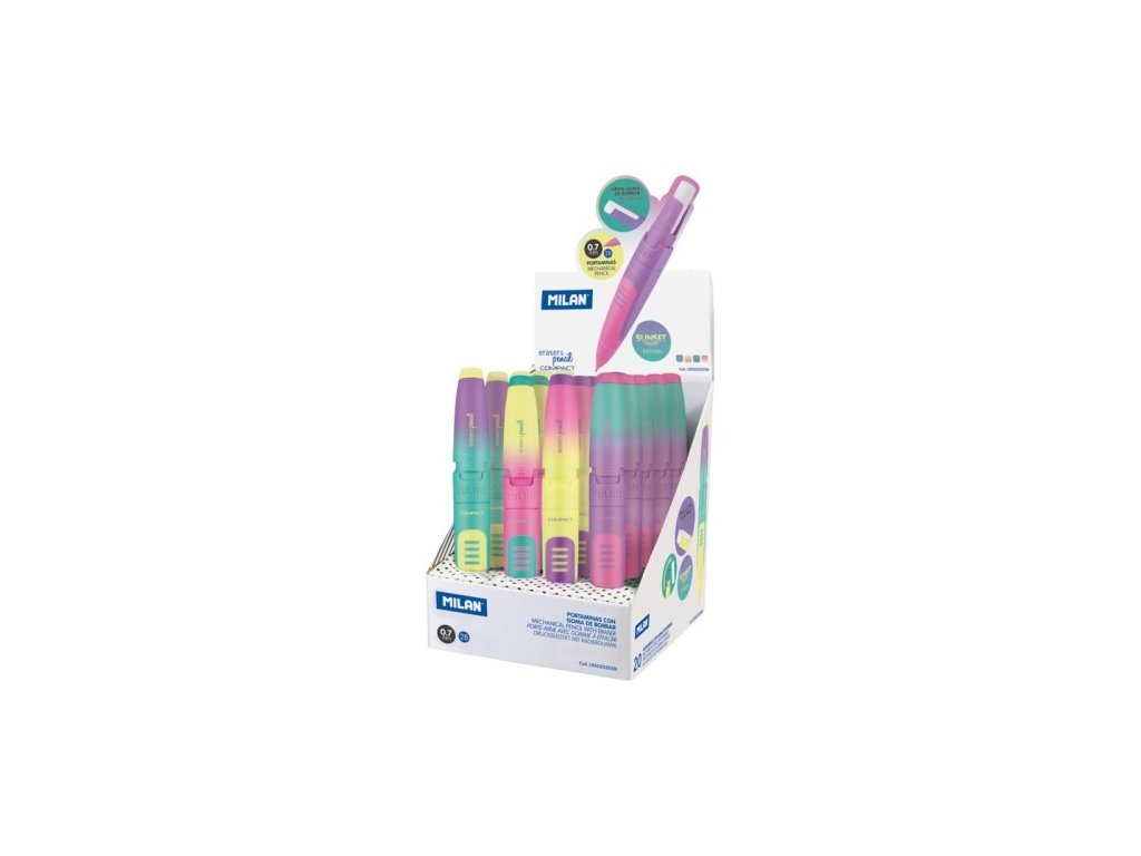 Mechanická tužka - pentelka 2B, šířka tuhy 0,7mm. Součástí pentelky je i guma, která je umístěná ve vrchní části. V oblíbeném designu Sunset. Kolekce SunsetVýrobce MILANbal / ks 20kart. / bal 360Rozměry 130 mmDoplňkové parametry