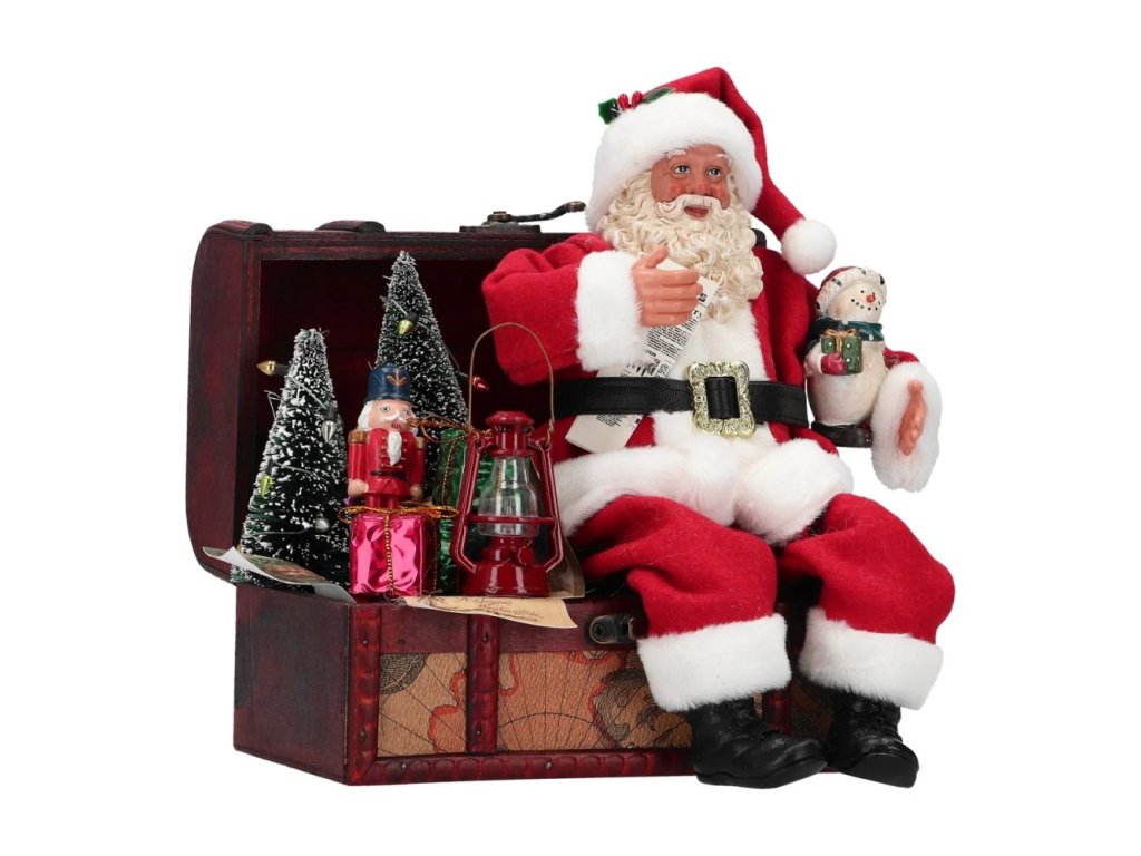 Vánoční dekorace Santu sedícího na kufru s dárky a figurkami.
