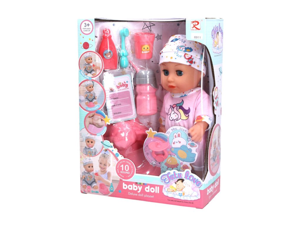 Miminko čurající. Velikost 30 cm. Zvukové efekty. 3xAG13 baterie součástí. Nočník, láhev, hrnek, sprcha, mycí prostředek, dudlík součástí.Doplňkové parametry