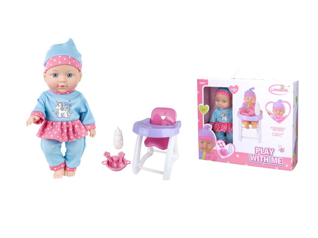 POPIS PRODUKTURoztomilé miminko ve slušivém oblečku s barevným jednorožcem potěší každou malou holčičku! Díky praktické jídelní židličce nebude problém miminko nakrmit! V balení nechybí také miska se lžičkou a vidličkou v růžové barvě a lahvička. Velikost: 30 cmDoplňkové parametry