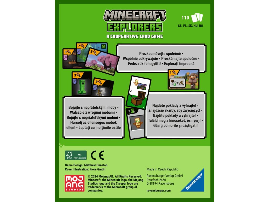 Ve světě Minecraftu je toho stále spousta k objevování. Prokažte svou odvahu a zvědavost při putování světem a hledání skrytých pokladů v dobrodružné karetní hře Minecraft Explorers. Prozkoumávejte společně svět Minecraftu, bojujte s nepřátelskými moby, najděte všechny potřebné poklady a bezpečně je uložte do truhel. Jen tak společně vyhrajete hru. Ale pozor, kryjte si záda a nenechte se přepadnout moby, jinak hra končí! Minecraft Explorers je kooperativní karetní hra vhodná pro 1-4 hráče od 8 let. Obsahuje: 30 karet s moby, 60 krajinných karet, 1 kartu Game Over, 12 karet s truhlou, 1 noční kartu, 6 hladových karet, herní pravidla.Doplňkové parametry