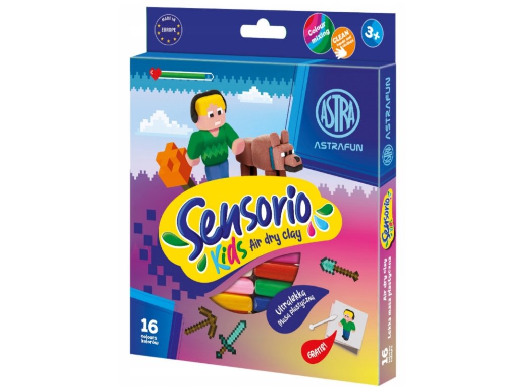 Modelovací hmota AstraFUN Sensorio Kids Pixel v balení 16 různých barev je lehká, jemná a příjemná na dotek. Vyniká „obláčkovou“ konzistencí, která umožňuje snadné tvarování, lepení a modelování. Po zaschnutí vytváří sametově hladký povrch, ideální pro tvorbu figurek, dekorací i drobných doplňků.