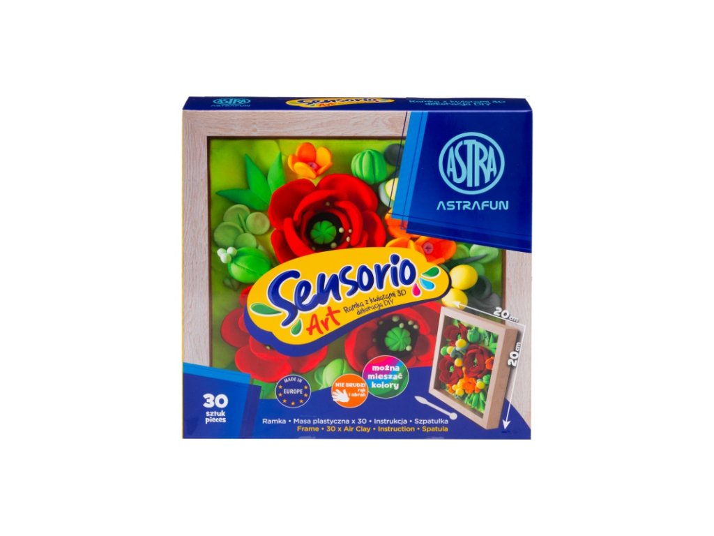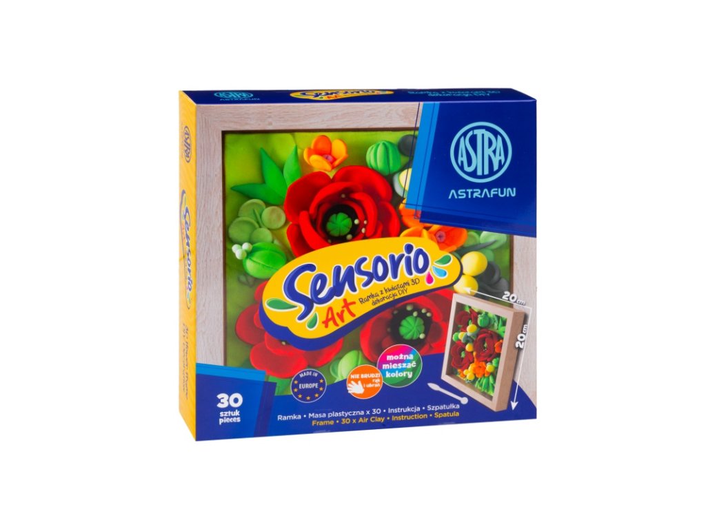 Kreativní sada ASTRA Sensorio Art Maky obsahuje 30 barev lehké modelovací hmoty, rámeček 20×20 cm, špachtli a návod. Umožňuje vytvářet jedinečné 3D obrazy s květinovým motivem – ideální pro děti i dospělé.