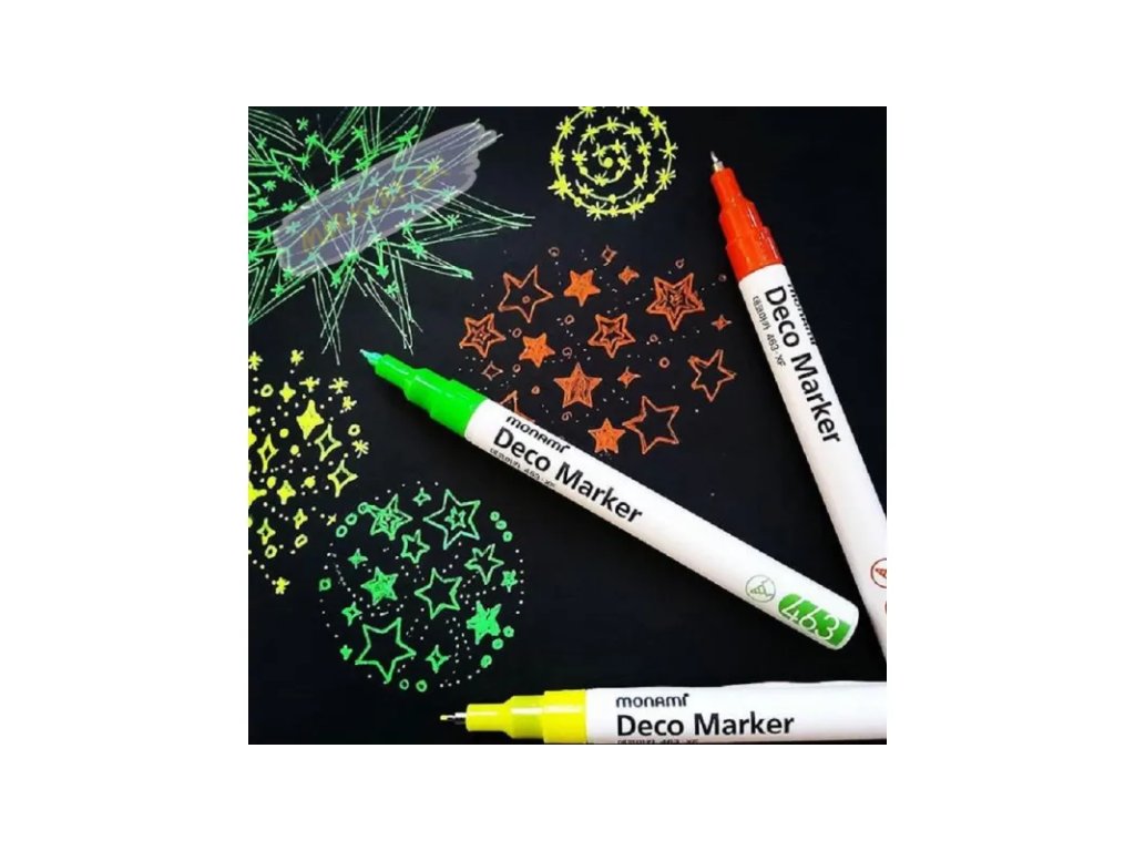 Pigmentový popisovač MONAMI® Deco Marker na vodní bázi má vynikající krycí schopnost i na tmavém povrchu. Je ideální pro umělecké a řemeslné projekty i pro domácí dekorace, pro kresbu, barvení celé plochy, zdobení detailu, označování a psaní. Vhodný téměř na všechny povrchy, např. dřevo, kov, plast, sklo. Nabízí celkem 36 barevných odstínů včetně osmi metalických a šesti fluorescenčních barev.• kulatý hrot o šířce stopy 0,7mm