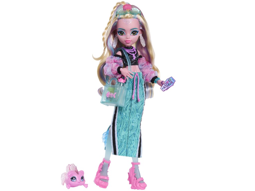 Panenka Lagoona Blue vypadá fantasticky v novém outfitu, který je stejně trendy jako stylový! Kromě nového účesu a vrstveného oblečení plného detailů má také svého mazlíčka rybičku jménem Neptuna a sedm doplňků, jako jsou svačina, nápoj, počítač, sluneční brýle, kabelka a další. Panenka neumí samostatně stát. Barvy a vzhled výrobku se mohou lišit.Doplňkové parametry