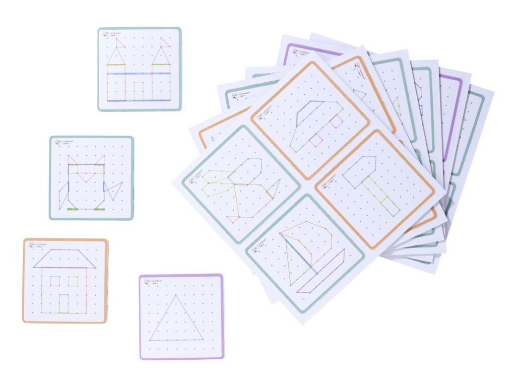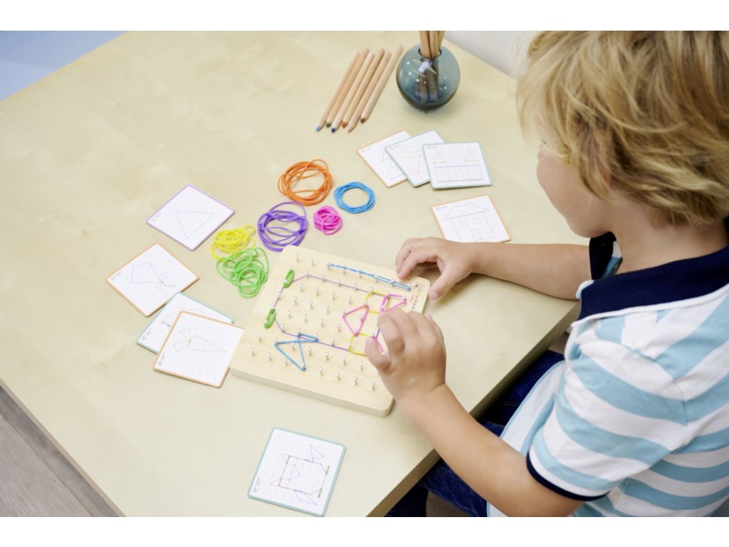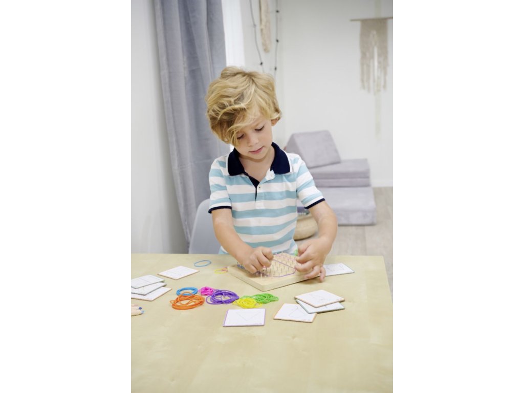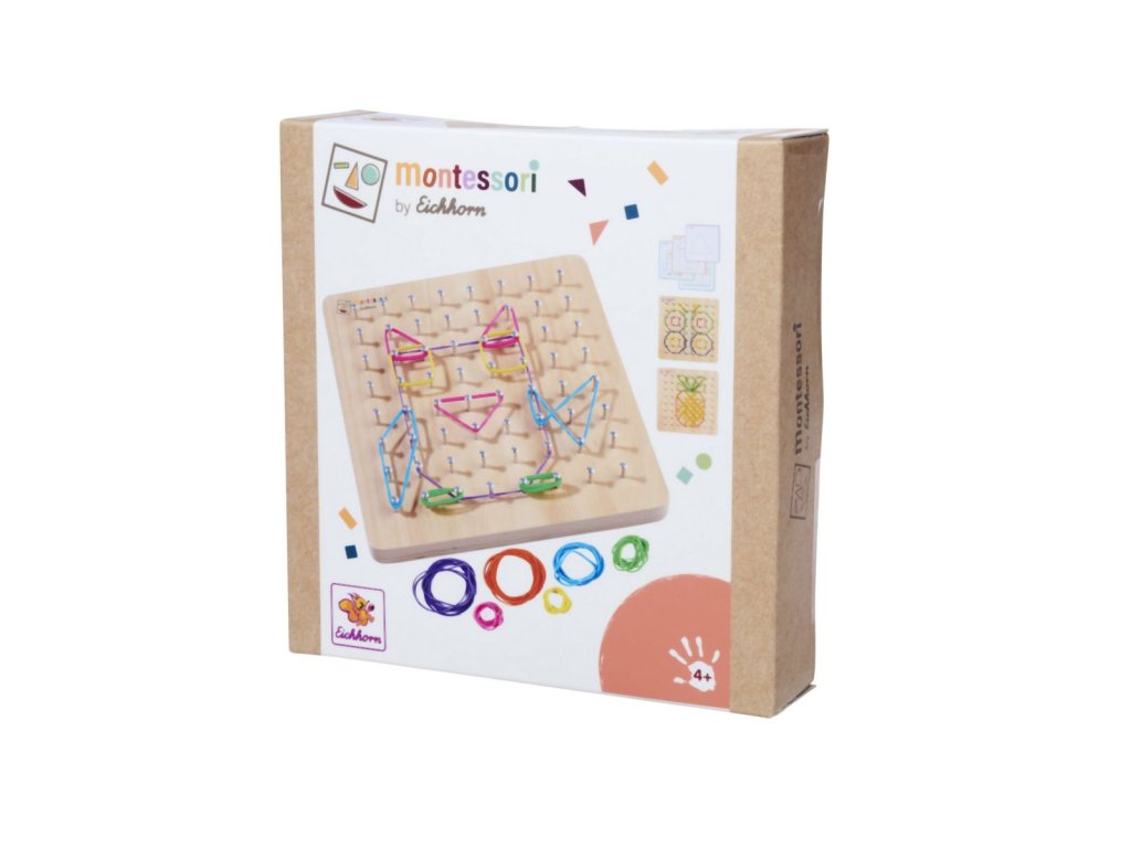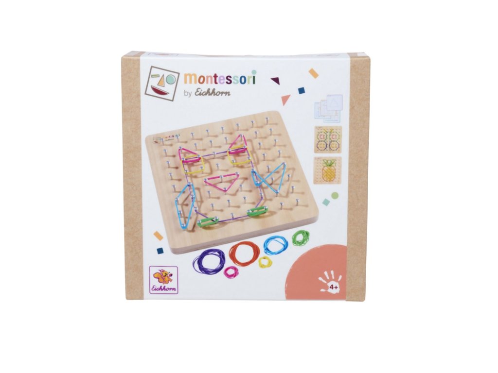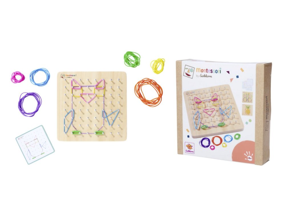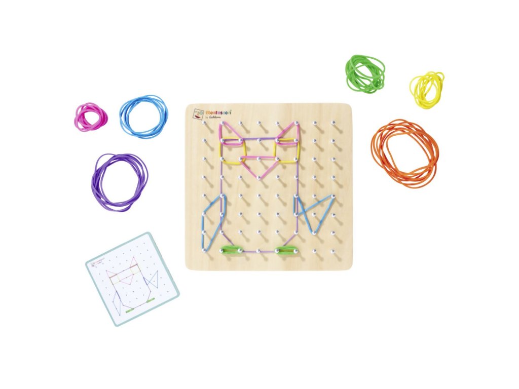 Montessori geometrická deska se 64 hřebíky a 60 barevnými gumičkami je skvělá sada pro podporu jemné motoriky a kreativity. Vaše dítě si může vymyslet postavičku podle svého přání nebo vytvořit motiv pomocí 24 karet s úkoly s různými úrovněmi obtížnosti. Geometrická deska je praktická a lze ji vzít kamkoli – do auta, do restaurace nebo k přátelům – ideální společník na cesty. Montessori geodeska o rozměrech 18×18 cm je vyrobena ze 100% lipové překližky s certifikátem FSC a je vhodná pro děti od 4 let.Doplňkové parametry