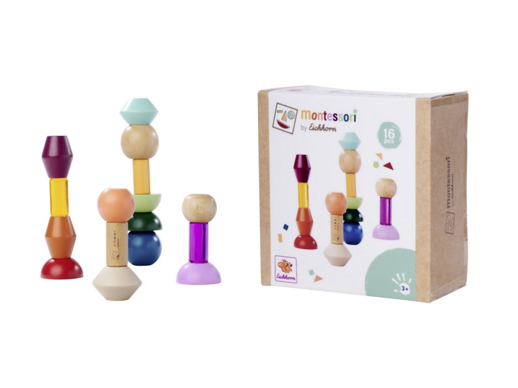 Tyto speciální geometrické stavebnice vyžadují trochu zručnosti. Ze 16 barevných stohovacích bloků můžete postavit vysoké věže a různé tvary. Vaše děti se naučí 5 nových geometrických tvarů a zamilují si dvě akrylové skleněné cihly. Bloky Montessori jsou vyrobeny ze 100% dřeva s certifikátem FSC a jsou vhodné pro děti od 3 let.Doplňkové parametry