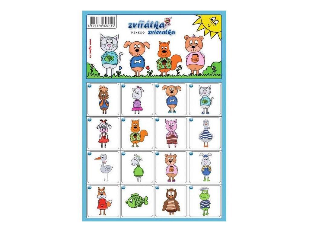 Pexeso s motivem kreslených zvířátek k vystřižení.Doplňkové parametry