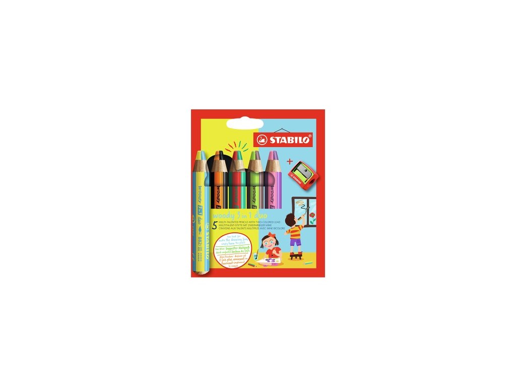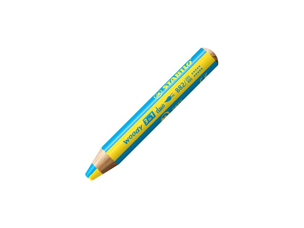 Multifunkční barvičky STABILO woody 3v1 duo pero zaujme svým dvoubarevným provedením! Dvojnásobná barevná zábava je zaručena se všestrannou barvičkou pro malé i velké umělce. Barevné výsledky kreslení vznikají pouhým otáčením Duo tuhou. Deset jedinečných barevných kombinací zajišťuje neomezenou kreativitu. Ve vysoké kvalitě STABILO woody 3v1 duo kombinuje barvičky, vodovky a voskovky v jednom.Doplňkové parametry