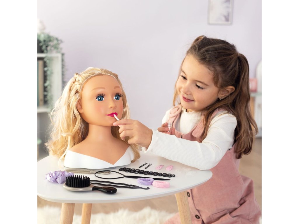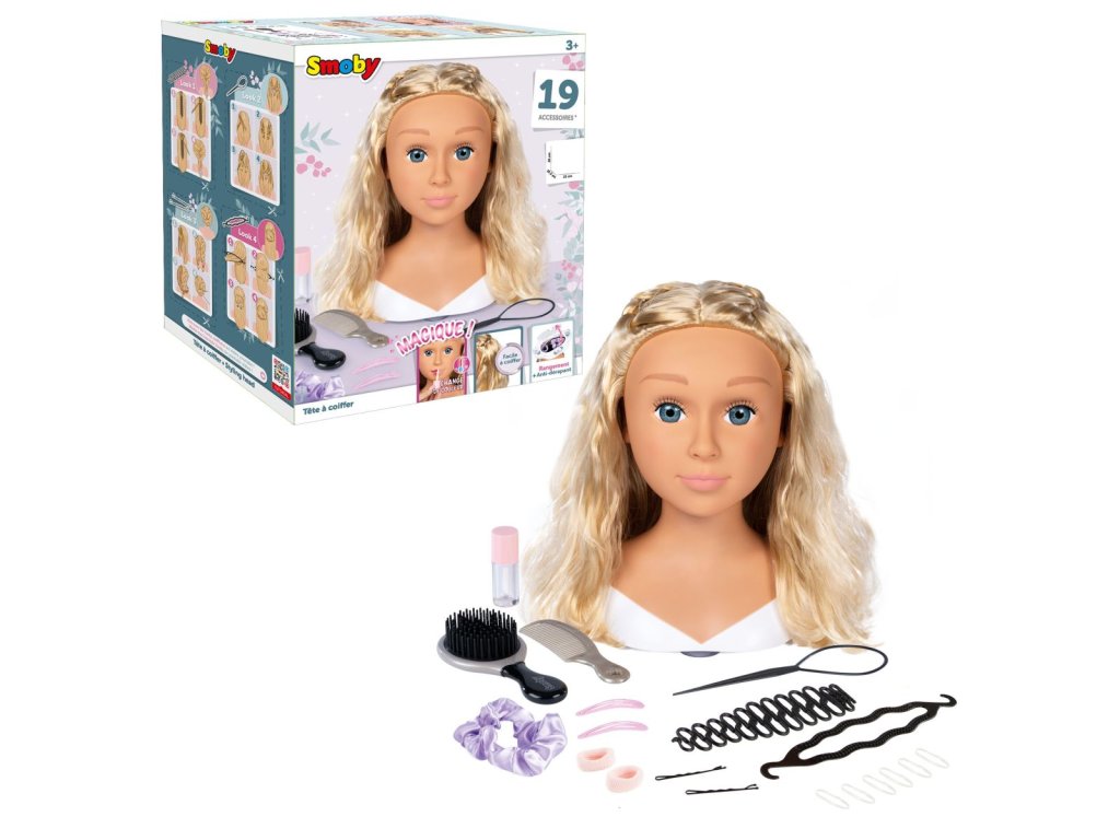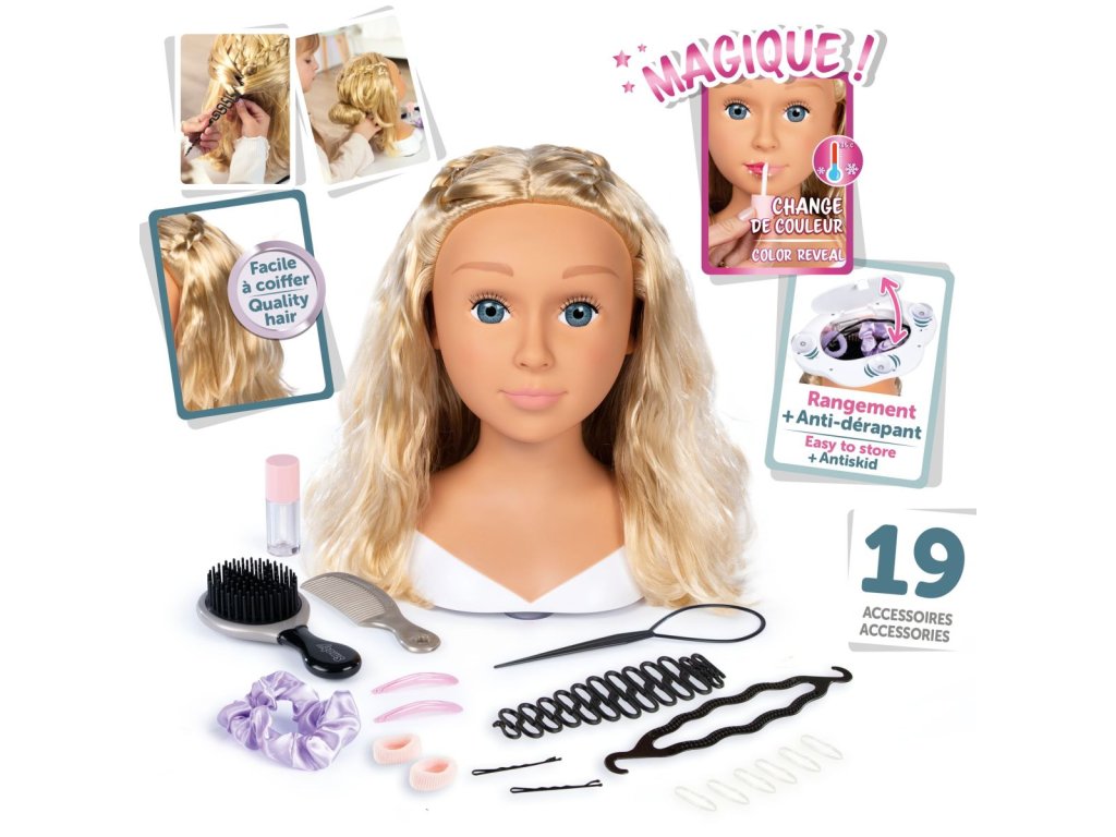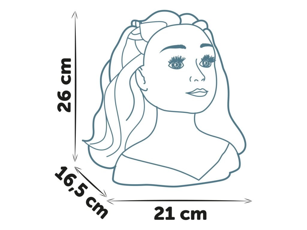 Česací hlava pro vytváření trendy účesů. S magickou funkcí, použij přiložený štěteček na rty namočený do studené vody a rty se krásně vybarví. Obsahuje 19 ks doplňků, které můžeš uschovat v tajné skrýši v podstavci hlavy. Vybaveno přísavkami na spodní části podstavce pro lepší stabilitu. Výška hlavy 26 cm.Doplňkové parametry
