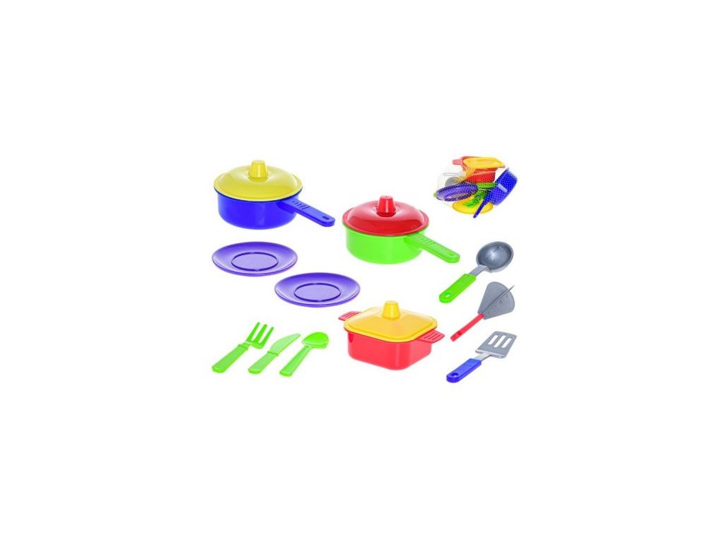 Rozměry balení (š v h): 20 x 15 x 12cm.Velikost pánvice (d): 16,5cm.Velikost příborů (d): 10,5cm.Materiál: kvalitní plast.Obsah balení: hrnec s poklicí 2ks, pánvice s poklicí, talířek 2ks, příbor 6ks, náčiní 3ks.Cena je uvedena za 1 balení - sadu hračky.Hračka je vhodná pro děti od 2 let.Doplňkové parametry