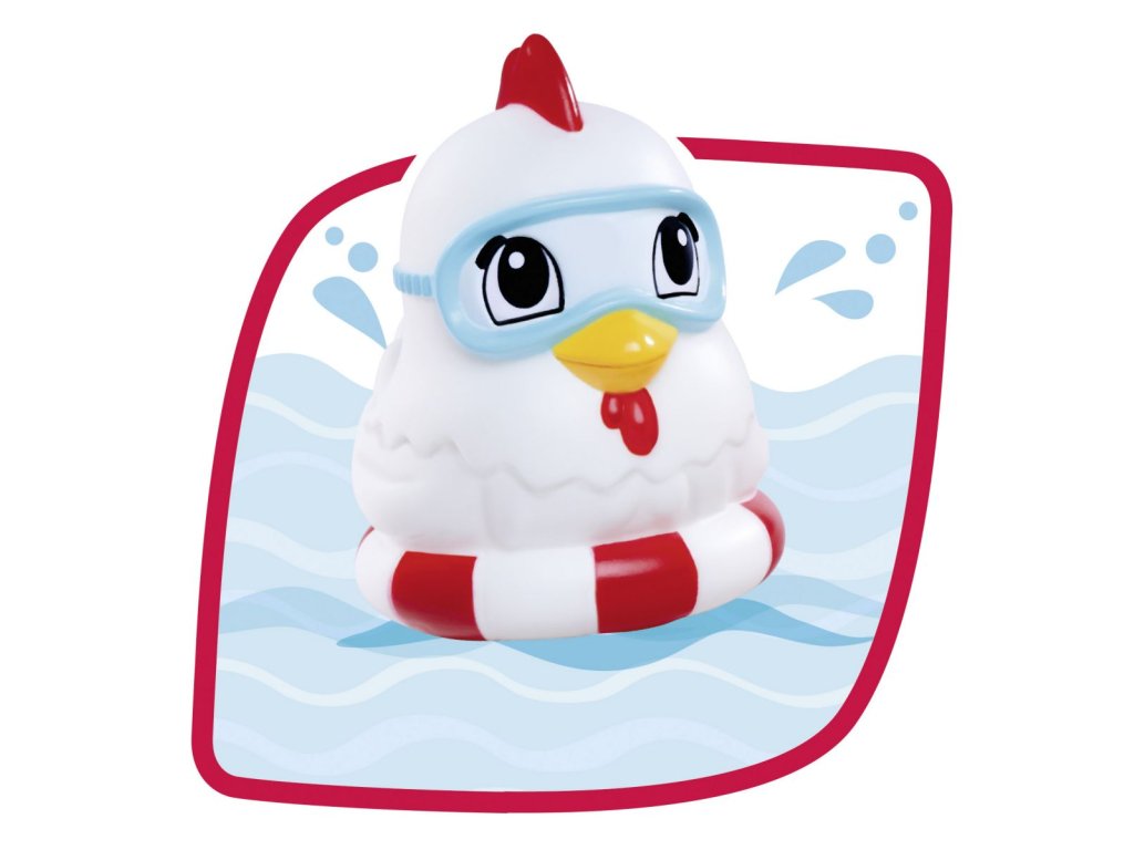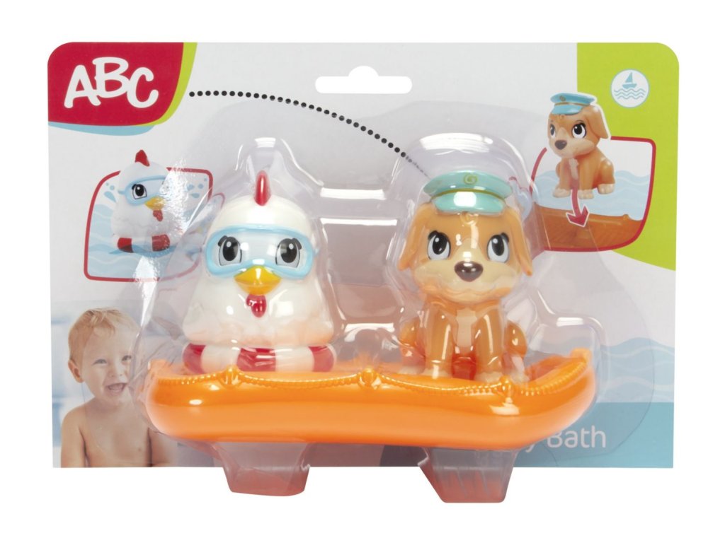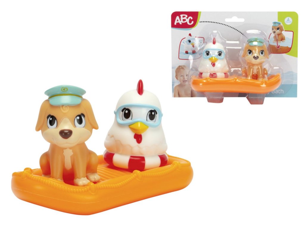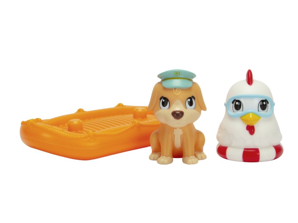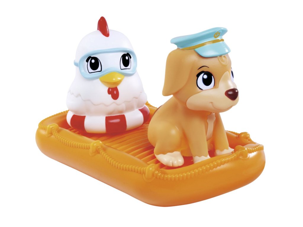 Loďka s vinylovými figurkami zvířát - pes a kuře do vany. Loďka plave na hladině, zvířatka se snadno připevní na loď.Doplňkové parametry