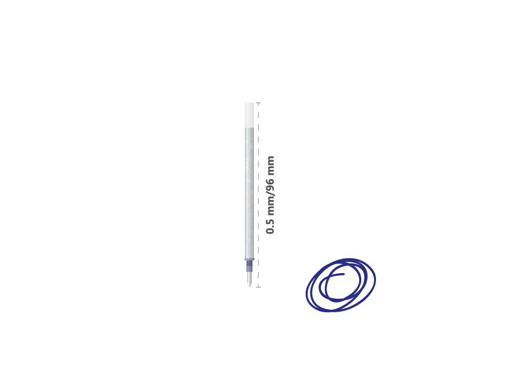 Gelová náplň do péra, modrá barva, délka 102 mm, s křídélky na zachycení pružinky, průměr kuličky 0,5 mm.Doplňkové parametry