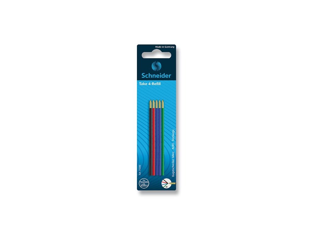 Náhradní náplně do vícebarevné kuličkové tužky Schneider Take 4. Balení obsahuje 2 ks modré a po 1 ks červené, černé a zelené náplně.Doplňkové parametry