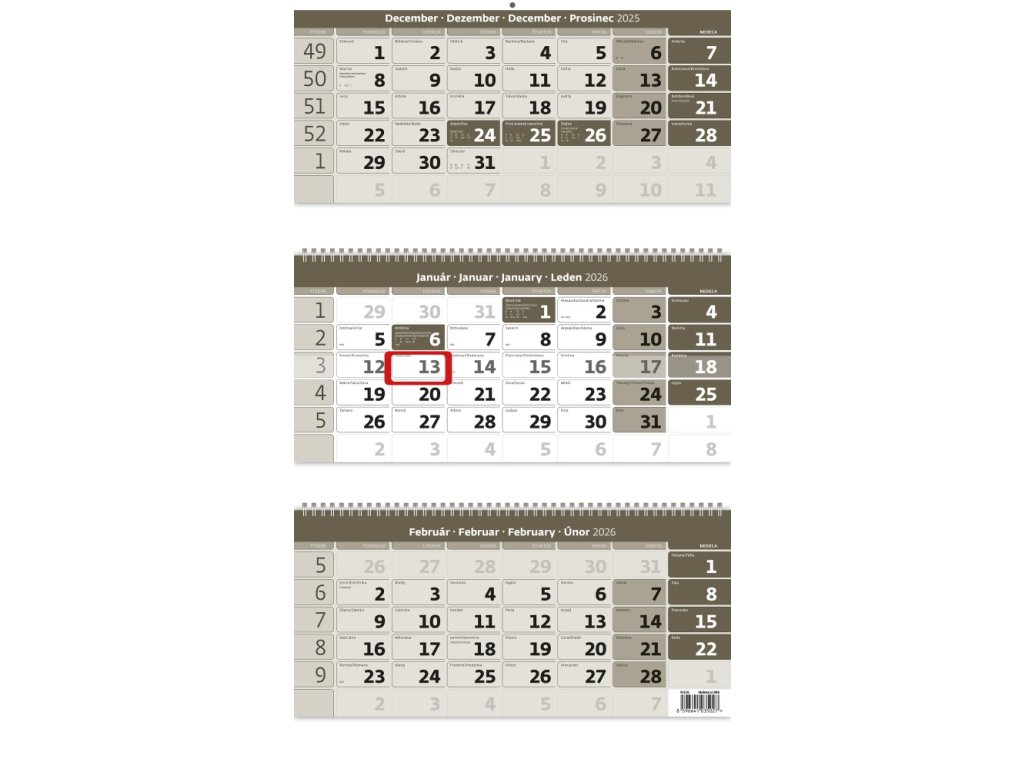 Formát kalendára: 31,5 x 55,5 cm + 18 cm• Kalendárium: slovenské trojmesačné menné so sviatkami európskych štátov (CZ / SK / A / B / D / F / H / CH / I / PL / RUS / UKR)• Rozsah kalendára: 3 x 12 listov• Priestor na potlač: 31,5 x 3,5 cm• Zložený kalendár: 31,5 x 18,5 cm• Vôjde sa do obálky B4Doplňkové parametry