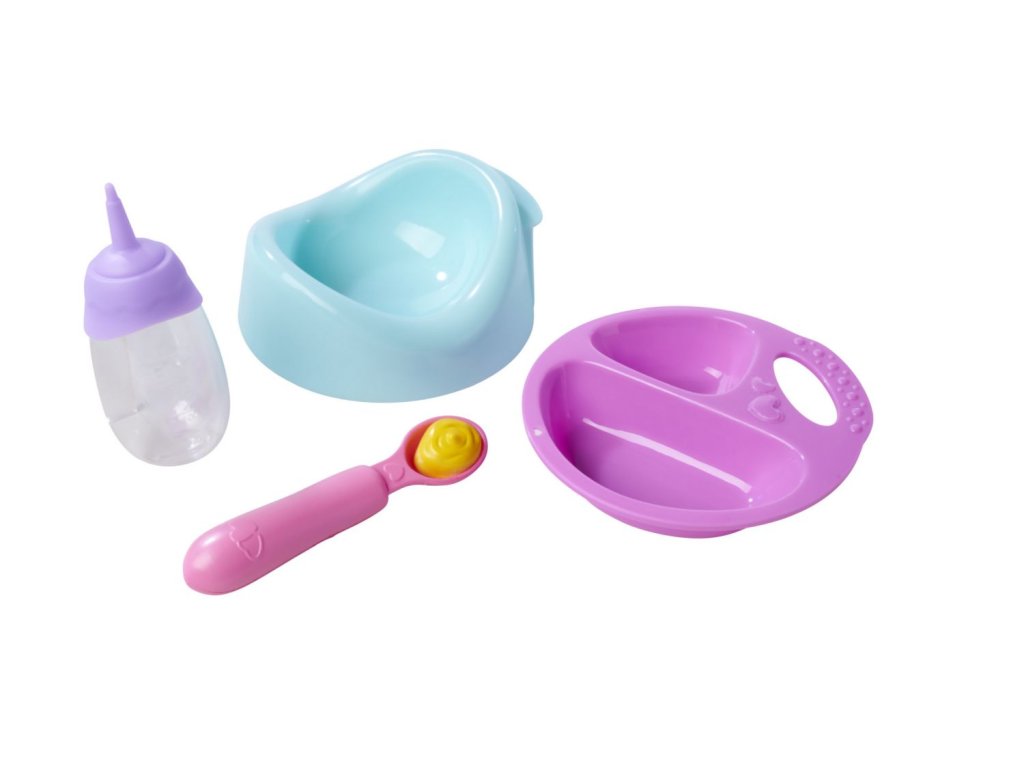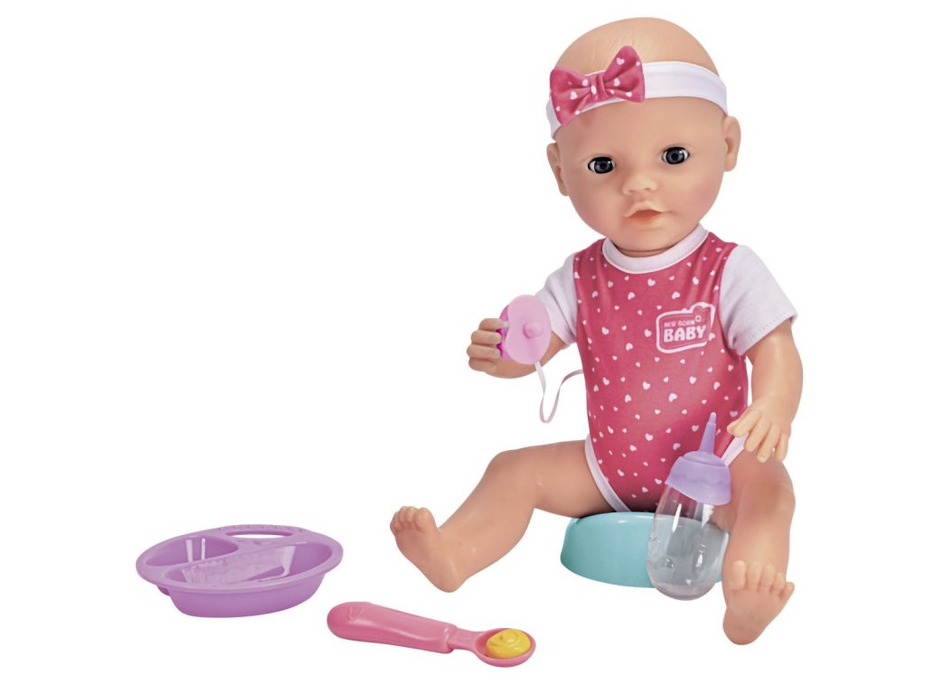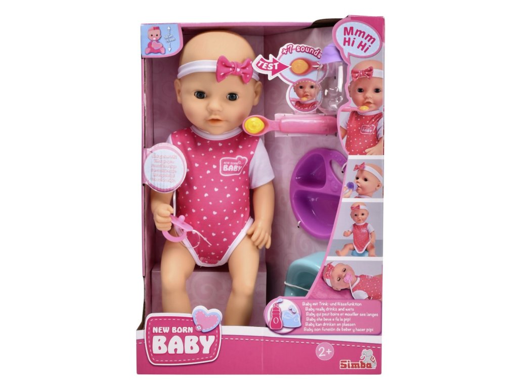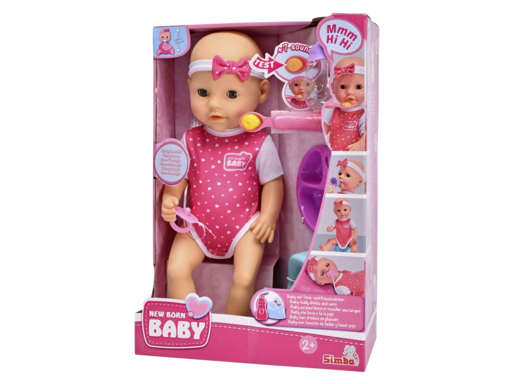 Panenka New Born Baby Hungry pije a čůrá a vydává zvuky. Balení obsahuje lahvičku, misku, kouzelnou lžičku a nočník. Výška panenky 38 cm.Doplňkové parametry
