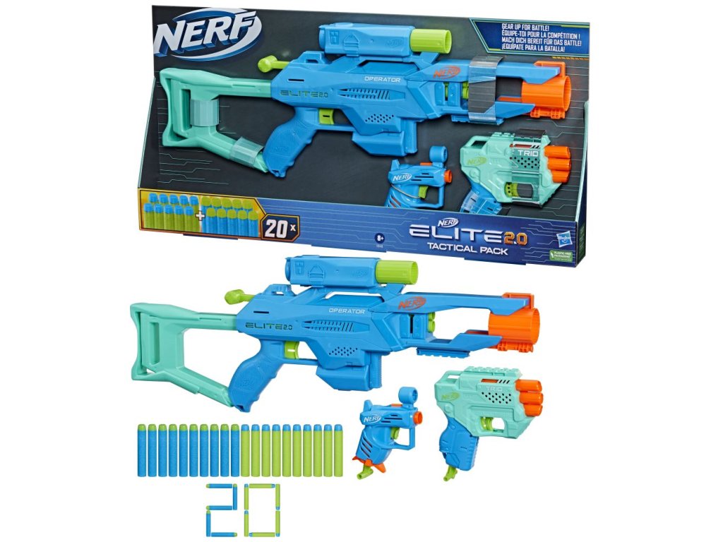 Ztrojnásobte svou bojovou akci s balíčkem NERF Elite 2.0 Tactical Pack, který obsahuje 3 blástry a 20 pěnových šipek NERF Elite! Pusťte se do 2hlavňových výstřelů s blástrem Operator DB-2, který vystřeluje 2 šipky za sebou, má 2šipkovou hlaveň, zatahovací rukojeť, zaměřovací dalekohled a pažbu. Pro odpalování tří šipek sáhněte po blástru Trio TD-3, který vypustí 3 šipky za sebou, má 3 hlavně a taktickou lištu. Připravte se na to být jedničkou ve hře s blástrem Ace SD-1, který vystřeluje 1 šipku, má stahovací nabíjecí rukojeť a integrovaný zásobník na 1 šipku. Tyto blástry jsou zábavné a snadno se používají, takže se okamžitě pustíte do her NERF! Nabijte, naplňte a zmáčkněte spoušť – 3 jednoduché kroky, abyste mohli začít hrát! Toto balení 3 blástrů je skvělé pro fanoušky NERF, kteří chtějí budovat své sbírky blástrů pro každou soutěžní výzvu. Je to skvělý dárek pro každého! Doporučují se brýle (nejsou součástí balení). Nejsou potřeba žádné baterie.Doplňkové parametry