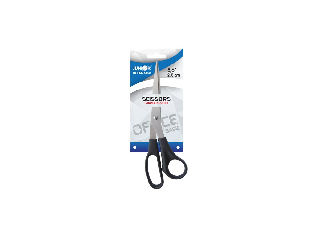 Nůžky s asymetrickými rukojeťmi z PVC, délka nůžek 215 mm, dodávané na blistru. Rozměr: 205x70mm, 80mm čepel.Doplňkové parametry
